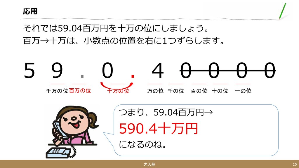 0 0 0 大人塾 20 一の位 十の位 百の位 千の位 万の位 十万の位 百万の位 千万の位 つまり、59.04百万円→ 590.4十万円 になるのね。