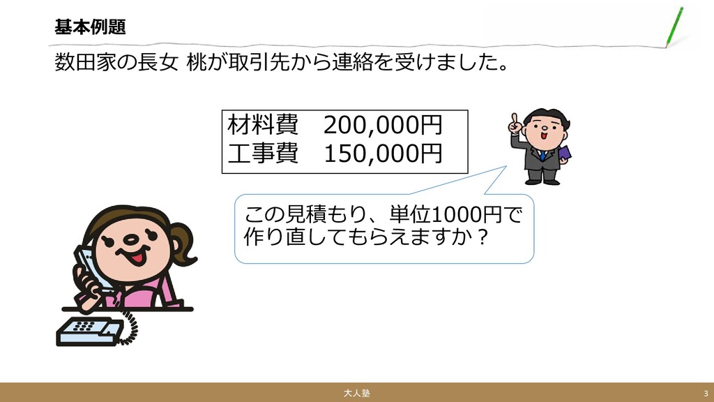 基本例題 この見積もり、単位1000円で 作り直してもらえますか? 大人塾 3 材料費 200,000円 工事費 150,000円 数田家の長女