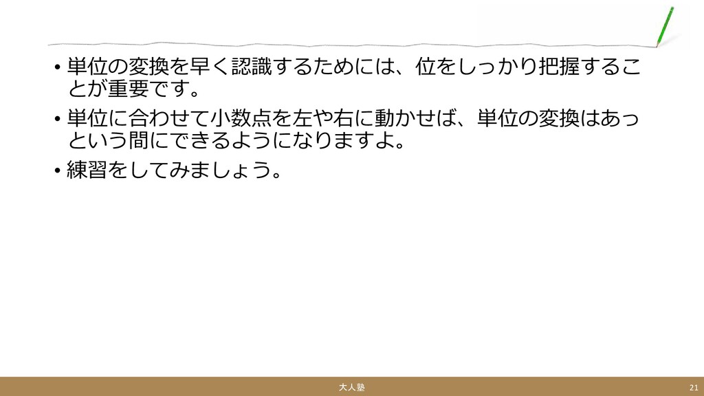 • 単位の変換を早く認識するためには、位をしっかり把握するこ とが重要です。 • 単位に合わせて小数点を左や右に動かせば、単位の変換はあっ という間にできるようになりますよ。 • 練習をしてみましょう。 大人塾 21