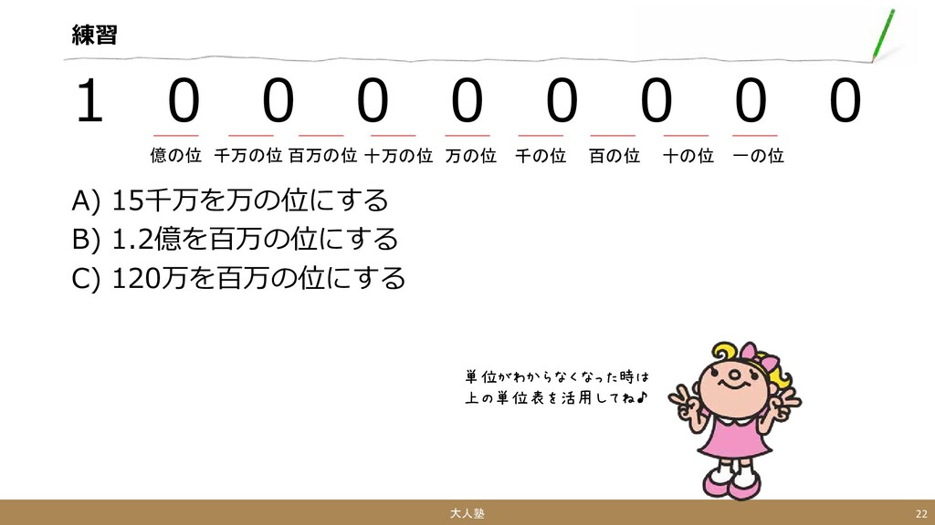A) 15千万を万の位にする B) 1.2億を百万の位にする C) 120万を百万の位にする 大人塾 22 単位がわからなくなった時は 上の単位表を活用してね♪ 一の位 十の位 百の位 千の位 万の位 十万の位 百万の位 千万の位 億の位