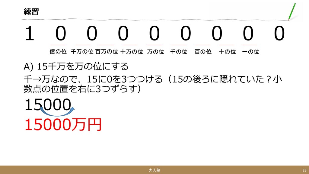 A) 15千万を万の位にする 千→万なので、15に0を3つつける(15の後ろに隠れていた?小 数点の位置を右に3つずらす) 15000 15000万円 大人塾 23 一の位 十の位 百の位 千の位 万の位 十万の位 百万の位 千万の位 億の位