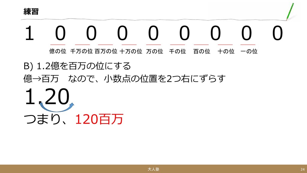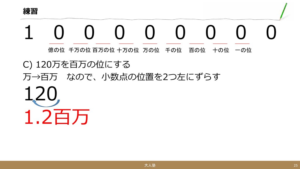 B) 1.2億を百万の位にする 億→百万 なので、小数点の位置を2つ右にずらす 1.20 つまり、120百万 大人塾 24 一の位 十の位 百の位 千の位 万の位 十万の位 百万の位 千万の位 億の位