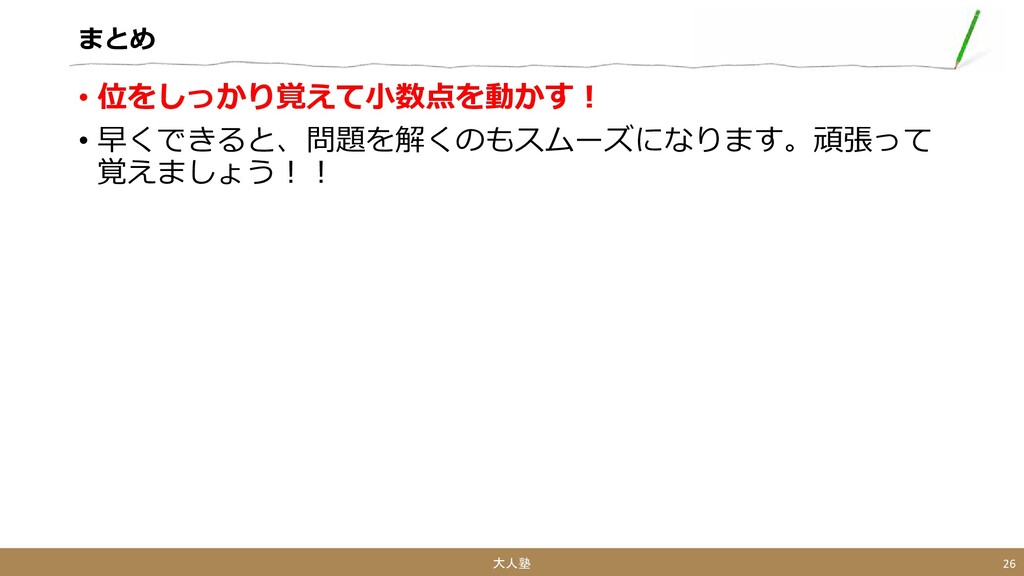 まとめ • 位をしっかり覚えて小数点を動かす! • 早くできると、問題を解くのもスムーズになります。頑張って 覚えましょう!! 大人塾 26