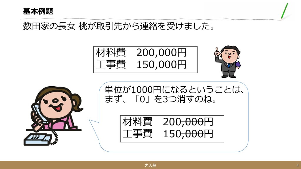 基本例題 単位が1000円になるということは、 まず、「0」を3つ消すのね。 大人塾 4 材料費 200,000円 工事費 150,000円 数田家の長女