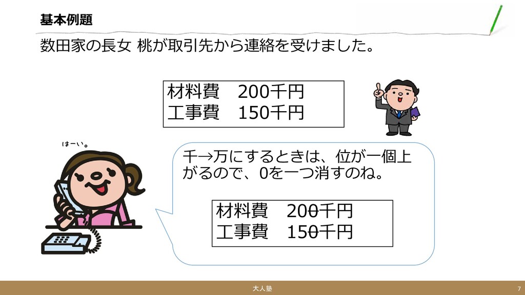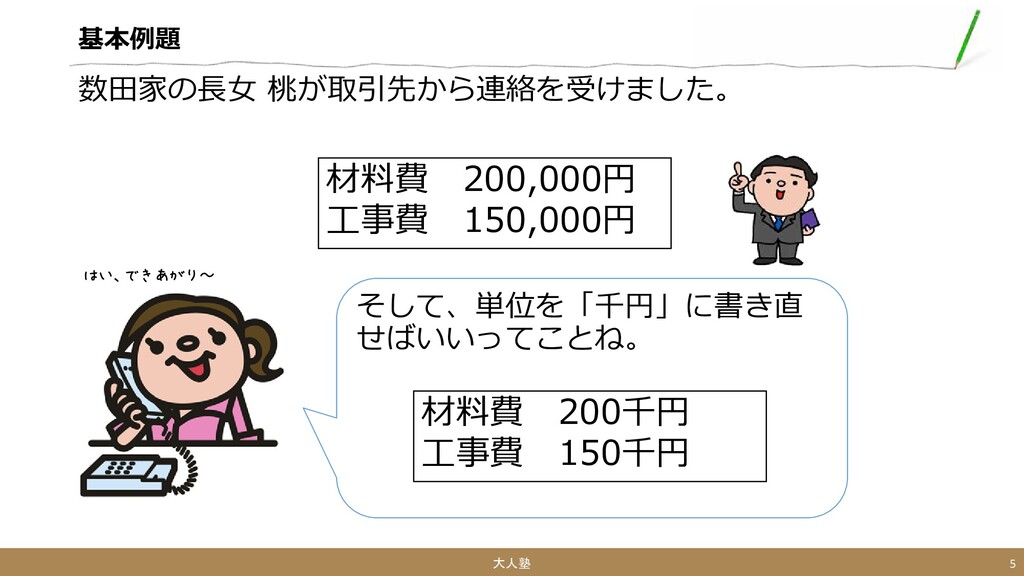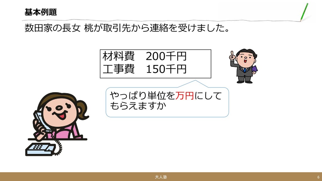 基本例題 やっぱり単位を万円にして もらえますか 大人塾 6 材料費 200千円 工事費 150千円 数田家の長女