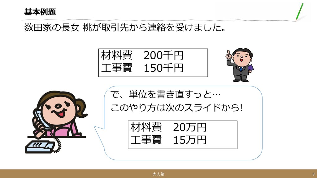 基本例題 千→万にするときは、位が一個上 がるので、0を一つ消すのね。 大人塾 7 材料費 200千円 工事費 150千円 数田家の長女