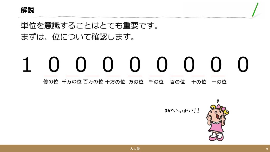 0 0 大人塾 9 一の位 十の位 百の位 千の位 万の位 十万の位 百万の位 千万の位 億の位 0がいっぱい!!
