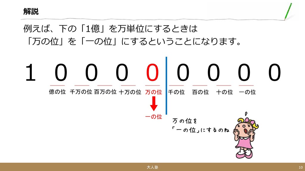 0 0 大人塾 10 万の位を 「一の位」にするのね 一の位 十の位 百の位 千の位 万の位 十万の位 百万の位 千万の位 億の位 一の位