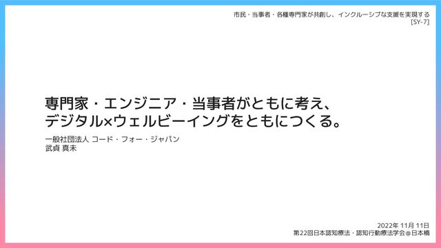 専門家・エンジニア・当事者がともに考え、 デジタル×ウェルビーイングをともにつくる。 一般社団法人 コード・フォー・ジャパン 武貞 真未 2022年 11月 11日 第22回日本認知療法・認知行動療法学会@日本橋