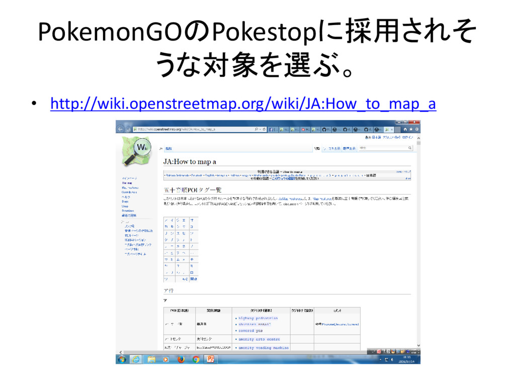PokemonGOのPokestopに採用されそ うな対象を選ぶ。 • http://wiki.openstreetmap.org/wiki/JA:How_to_map_a