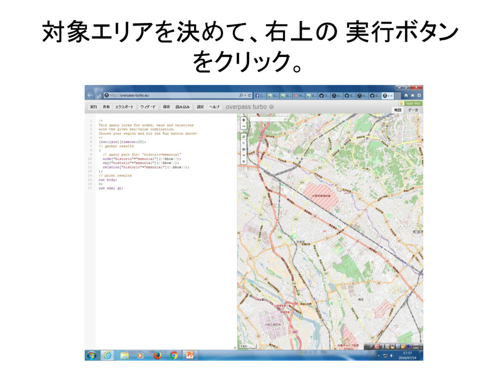 右下のツールからoverpass-turbo のリンク を開く。 • http://overpass-turbo.eu/…