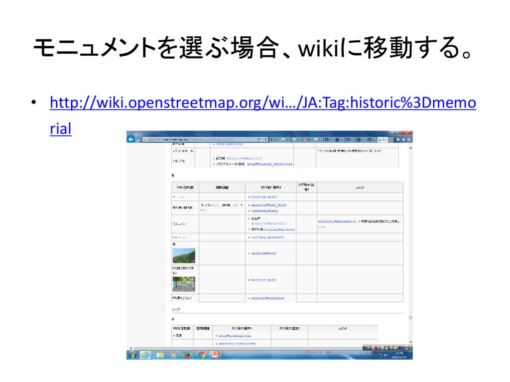 モニュメントを選ぶ場合、wikiに移動する。 • http://wiki.openstreetmap.org/wi…/JA:Tag:historic%3Dmemo rial