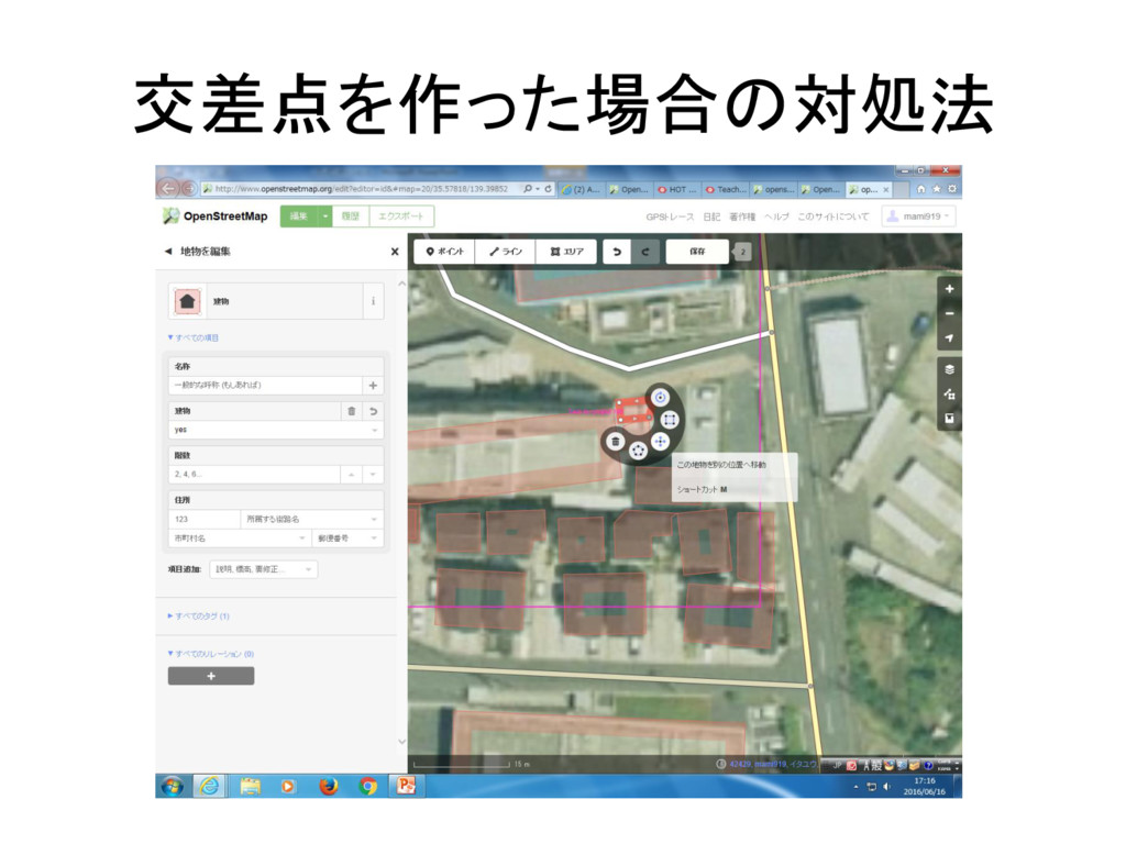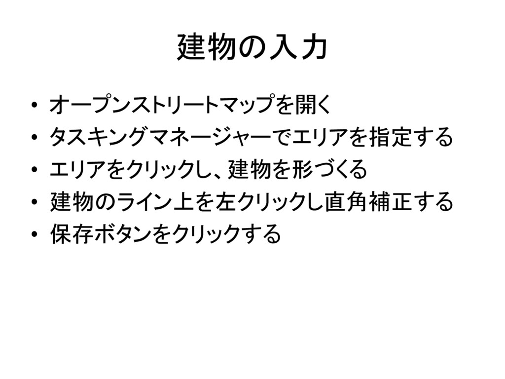 建物の入力 • オープンストリートマップを開く • タスキングマネージャーでエリアを指定する • エリアをクリックし、建物を形づくる • 建物のライン上を左クリックし直角補正する •