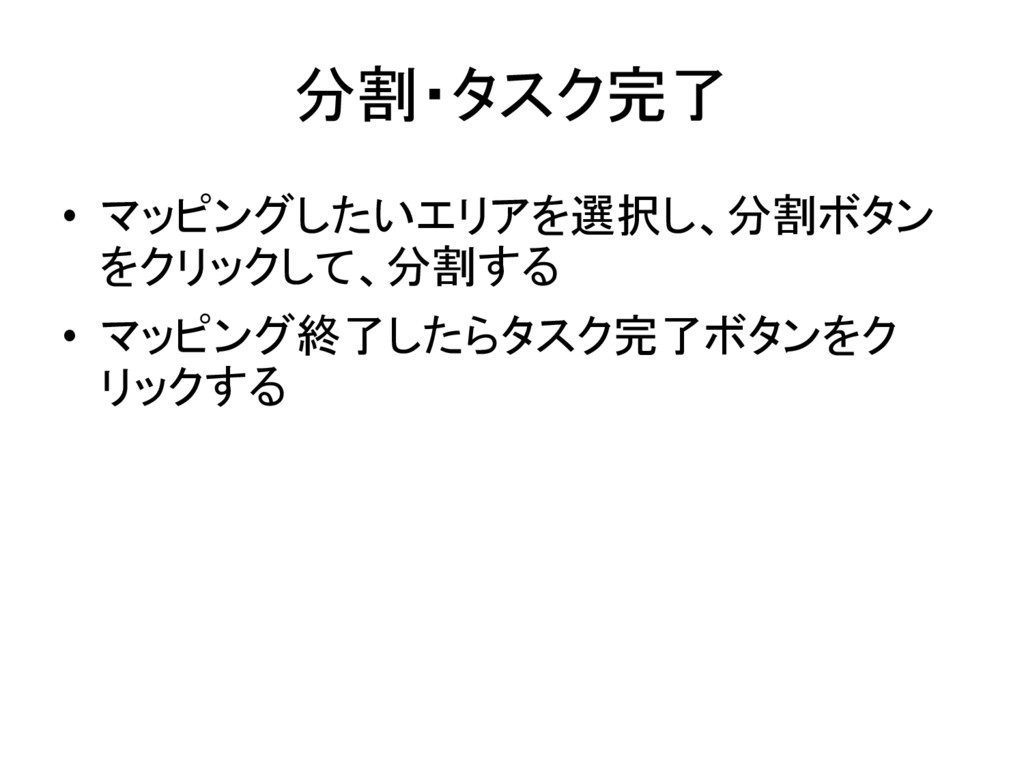 分割・タスク完了 • マッピングしたいエリアを選択し、分割ボタン をクリックして、分割する • マッピング終了したらタスク完了ボタンをク リックする