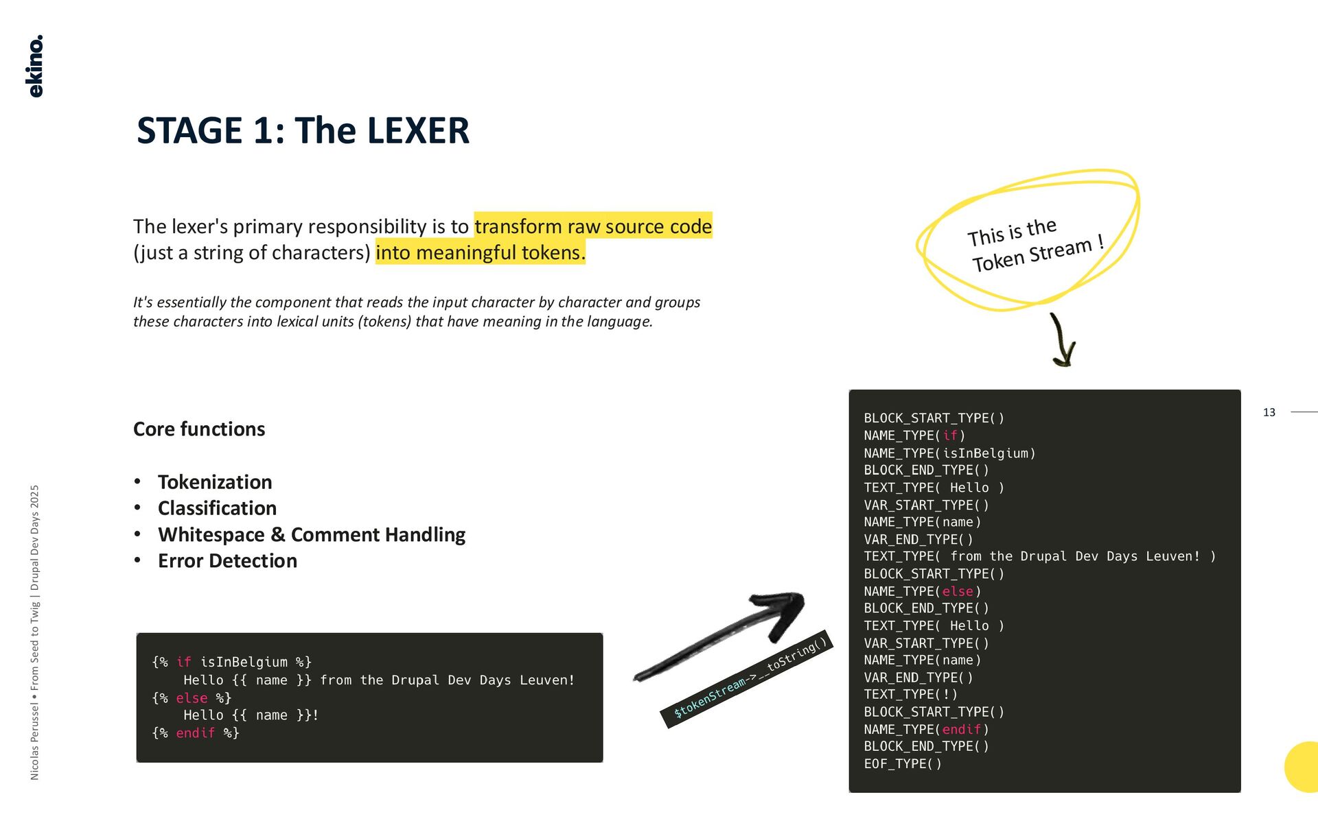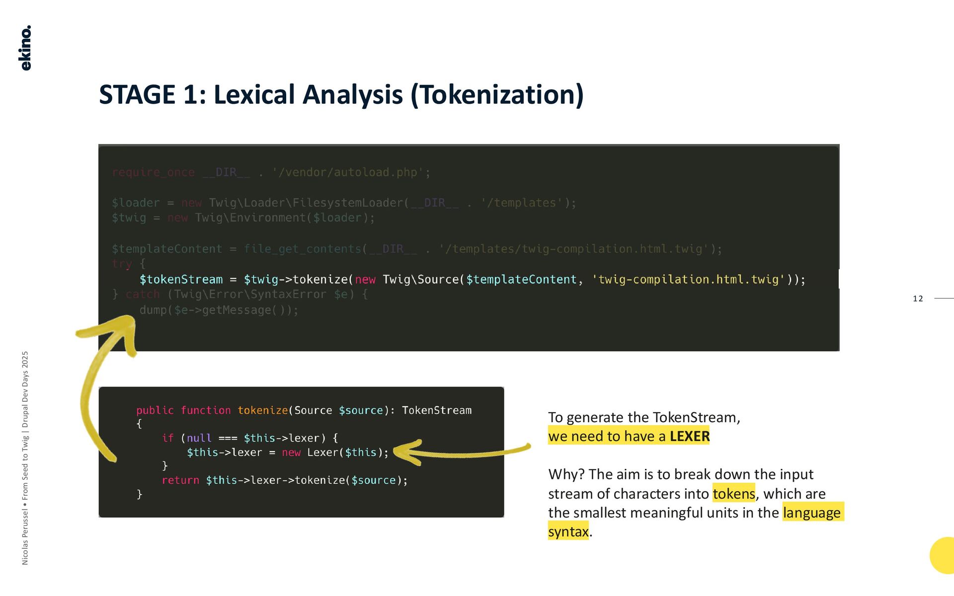 This stage involves the Tokenizer, which, in Twig, is the same component as the Lexer.