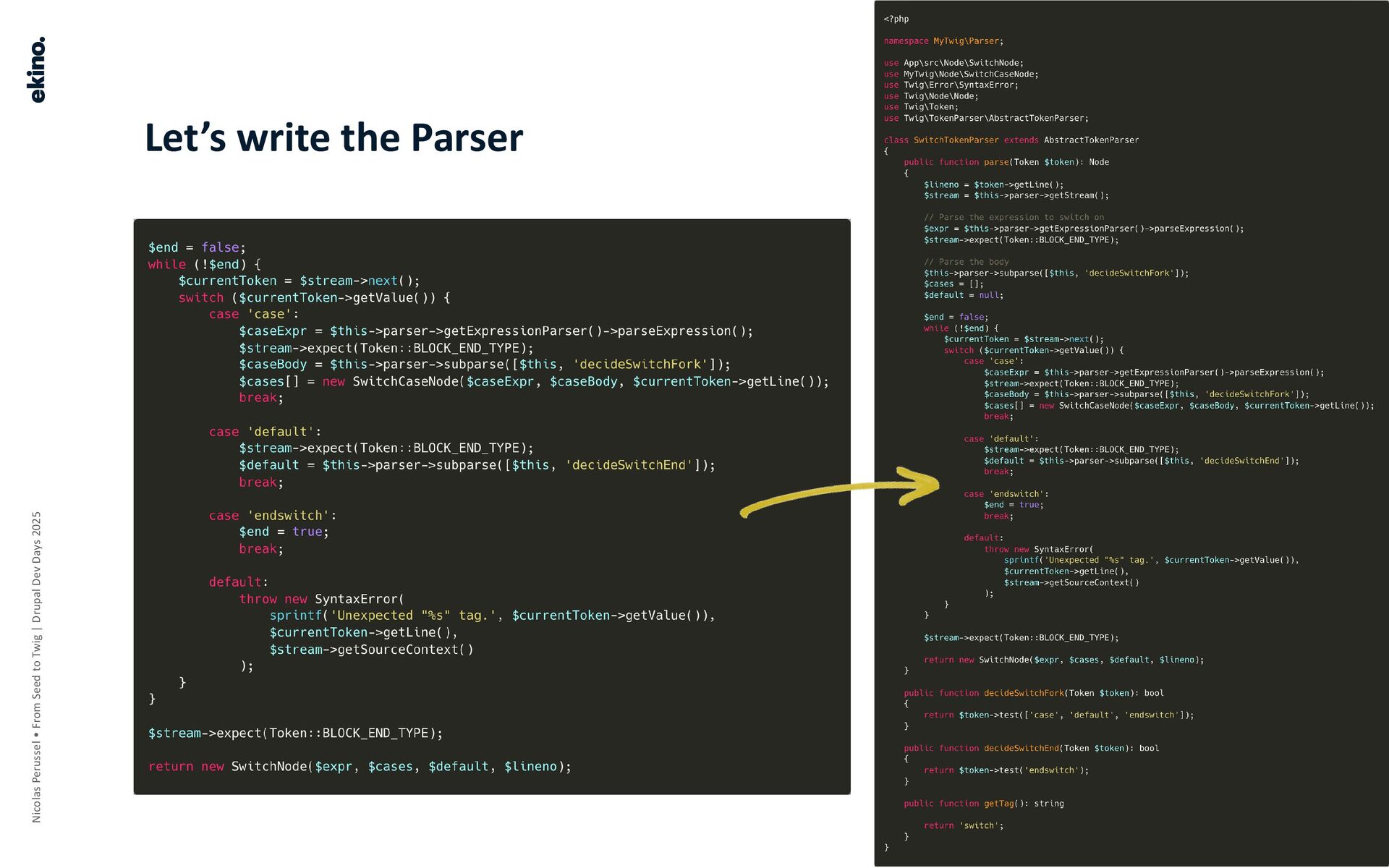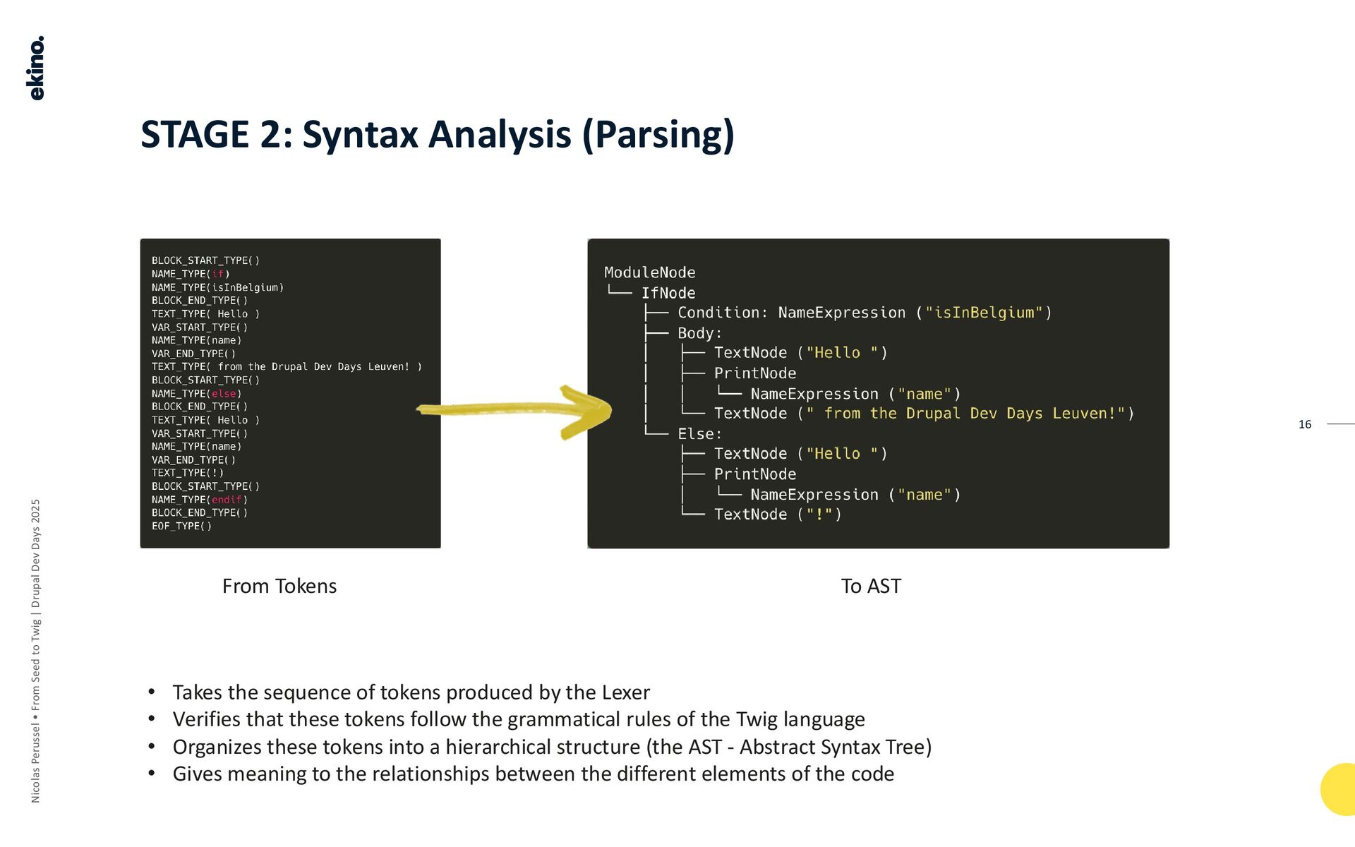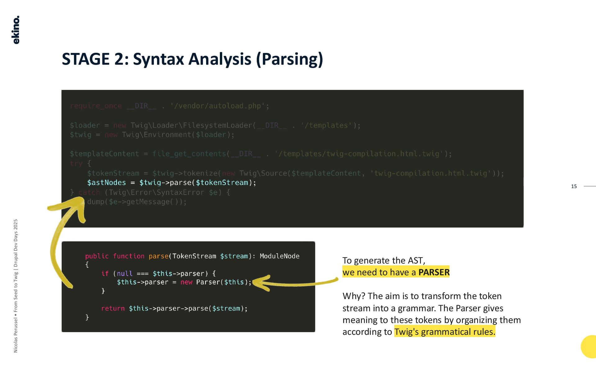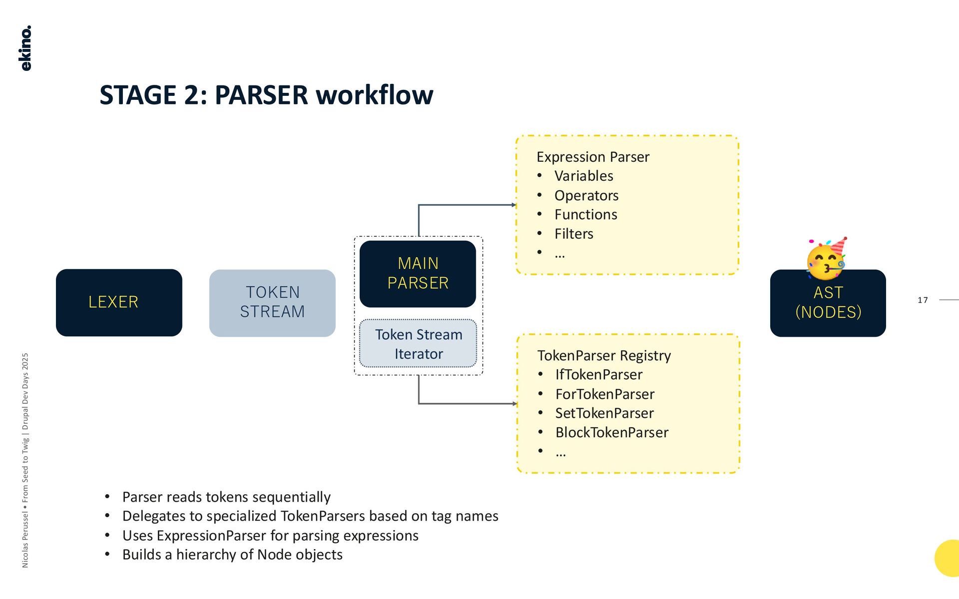 • Aim: To transform the token stream into a grammar (the AST). The Parser provides meaning to the tokens by organizing them according to Twig's grammatical rules.
