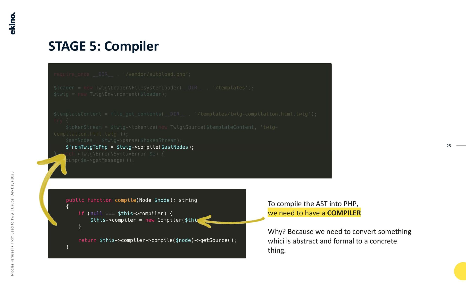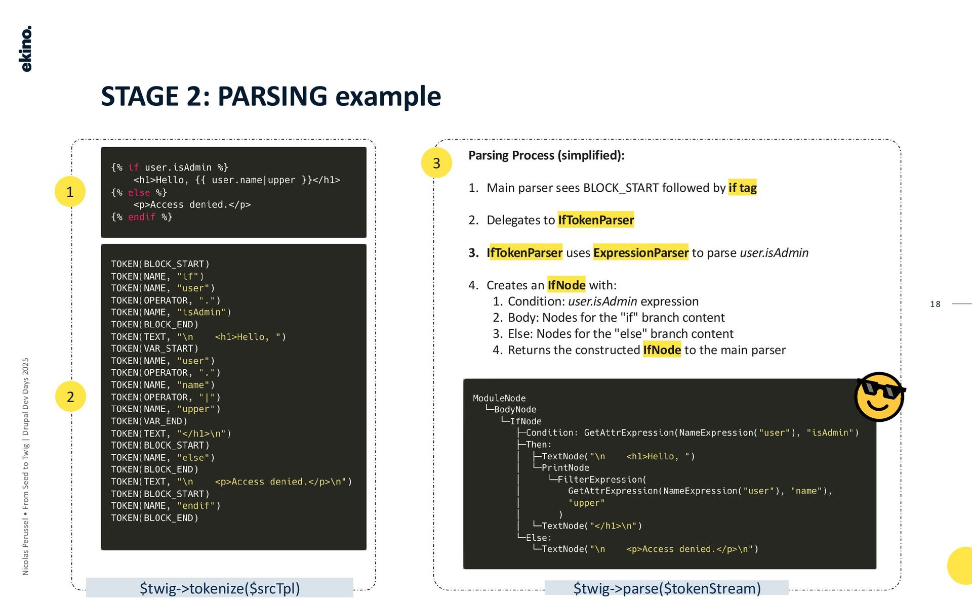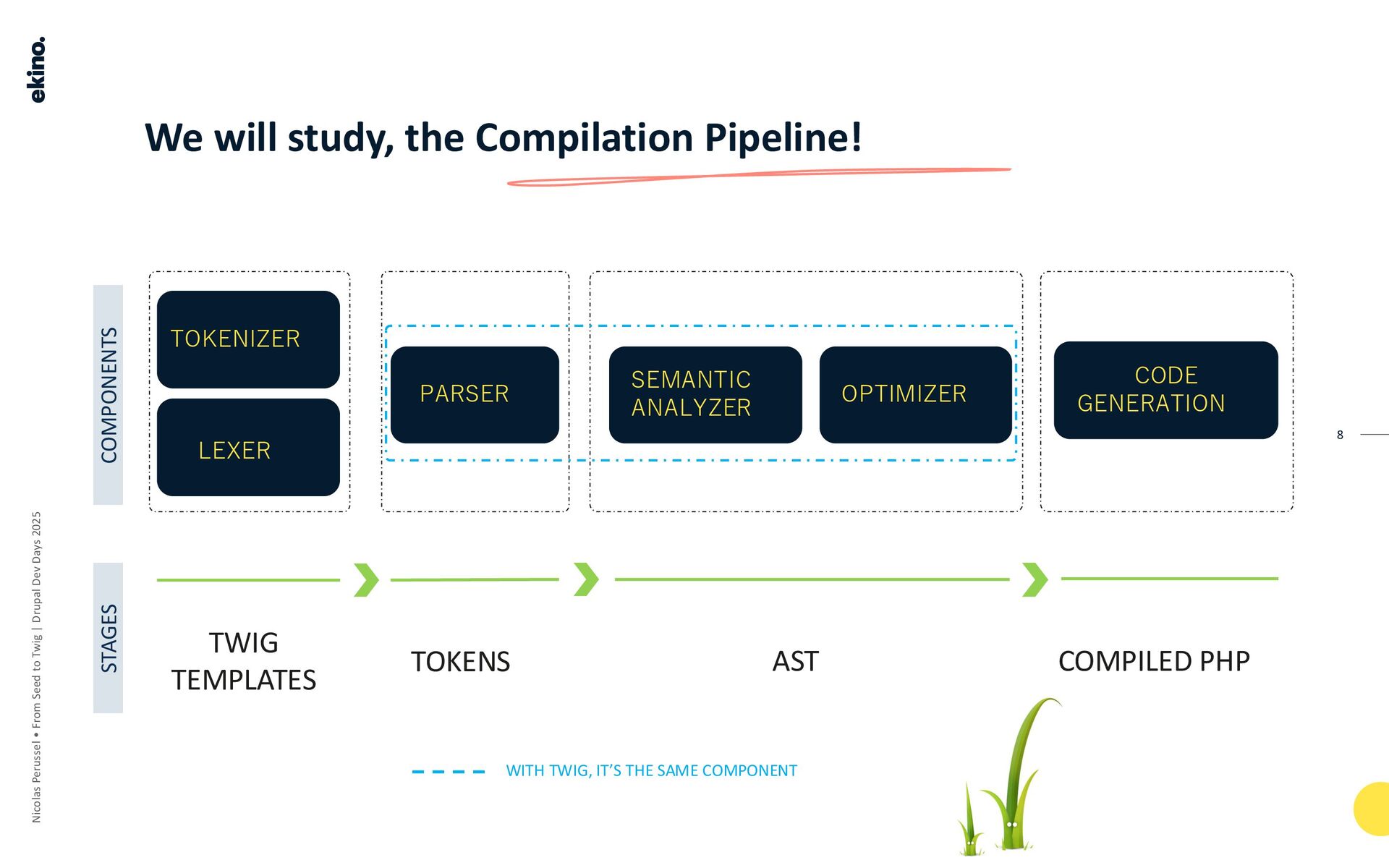 The pipeline converts TWIG TEMPLATES into COMPILED PHP through several stages, using TOKENS and the AST (Abstract Syntax Tree, which the speaker refers to as "Ice-Tea") as intermediate steps.