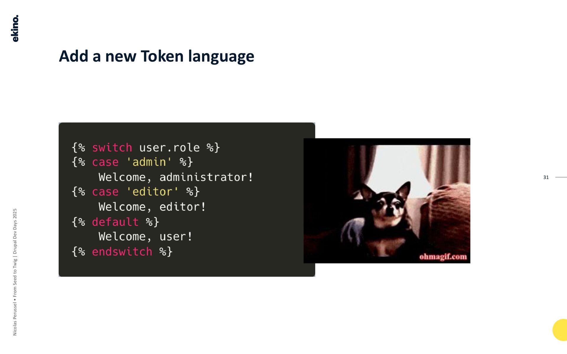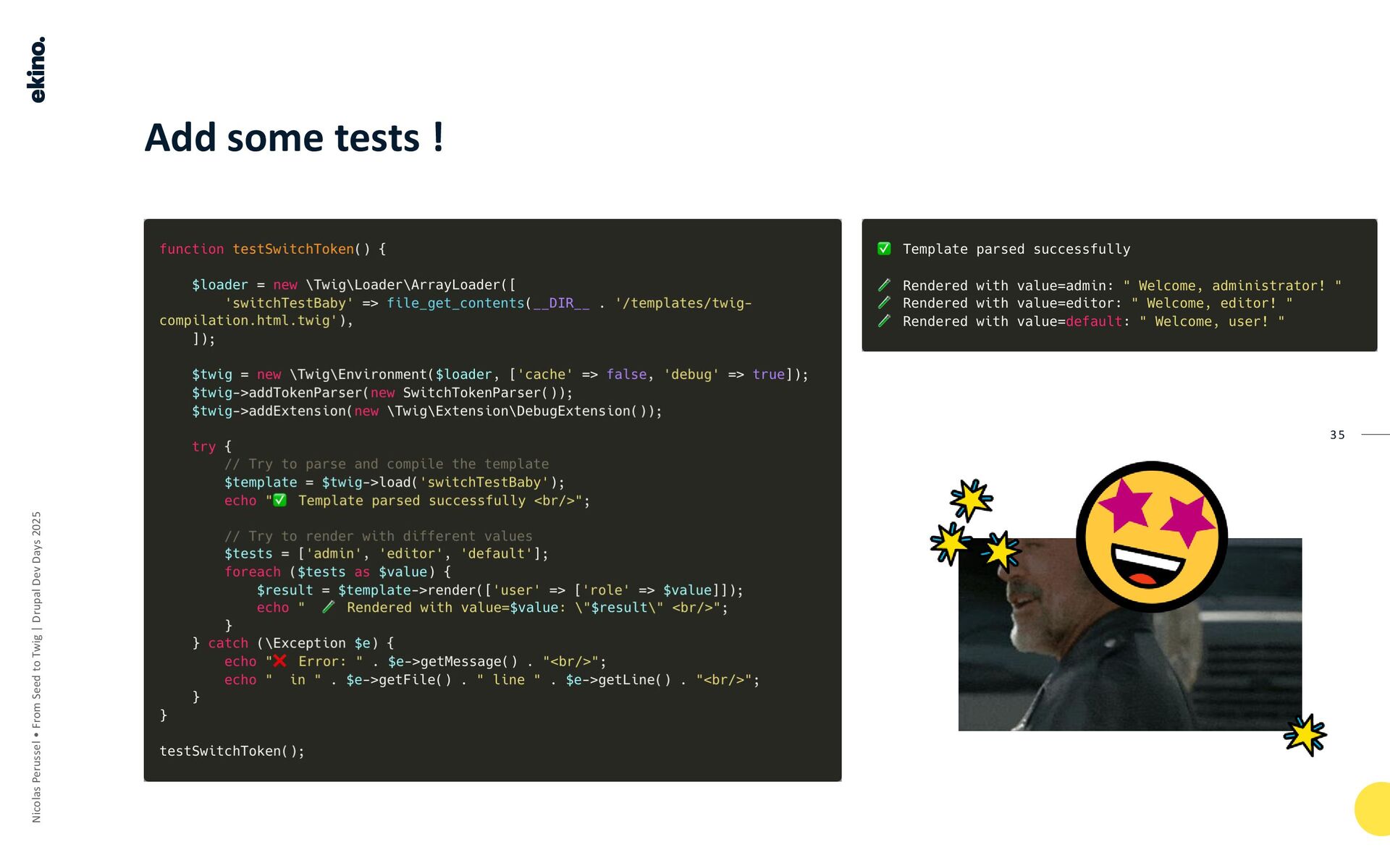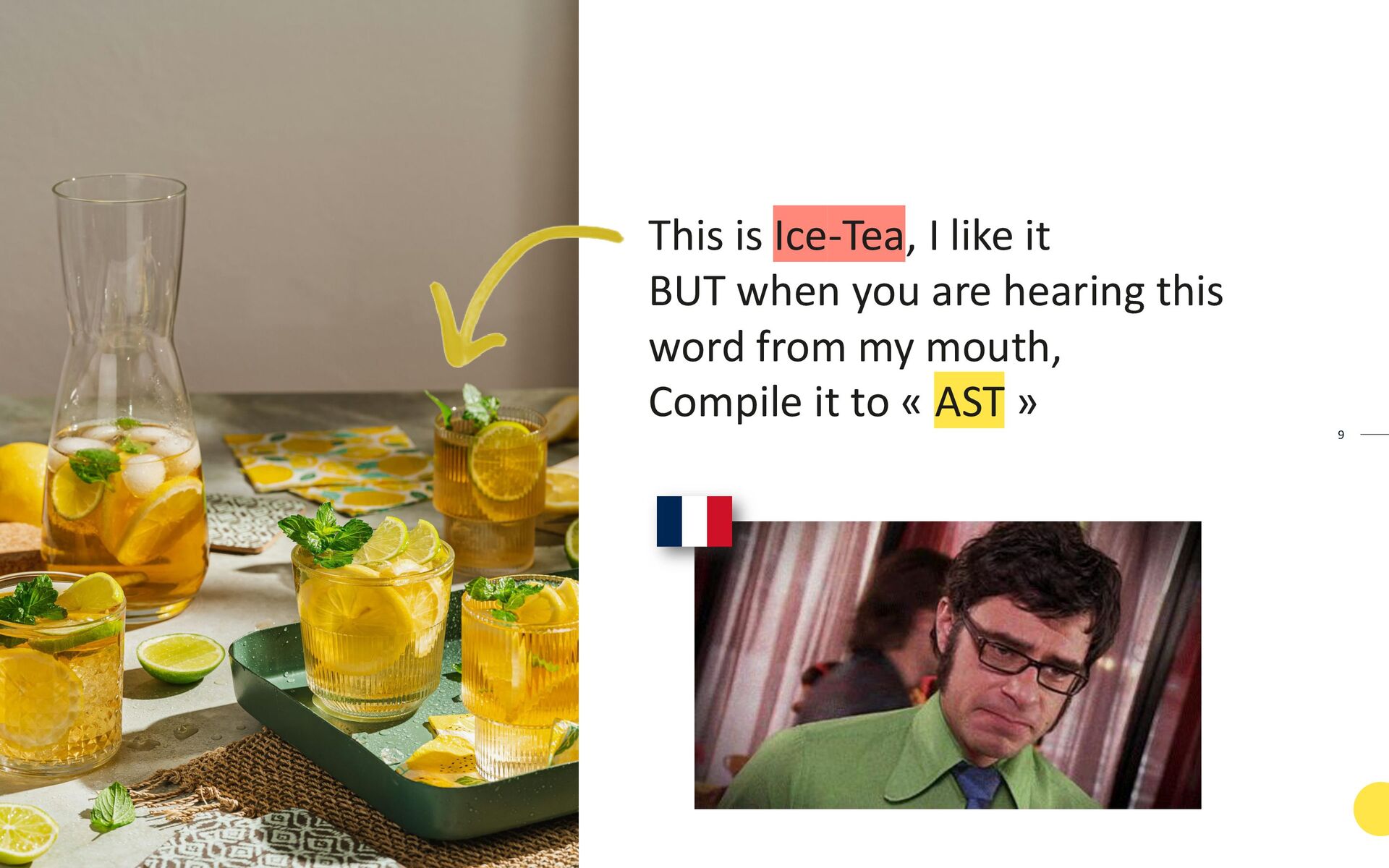 The pipeline converts TWIG TEMPLATES into COMPILED PHP through several stages, using TOKENS and the AST (Abstract Syntax Tree, which the speaker refers to as "Ice-Tea") as intermediate steps.