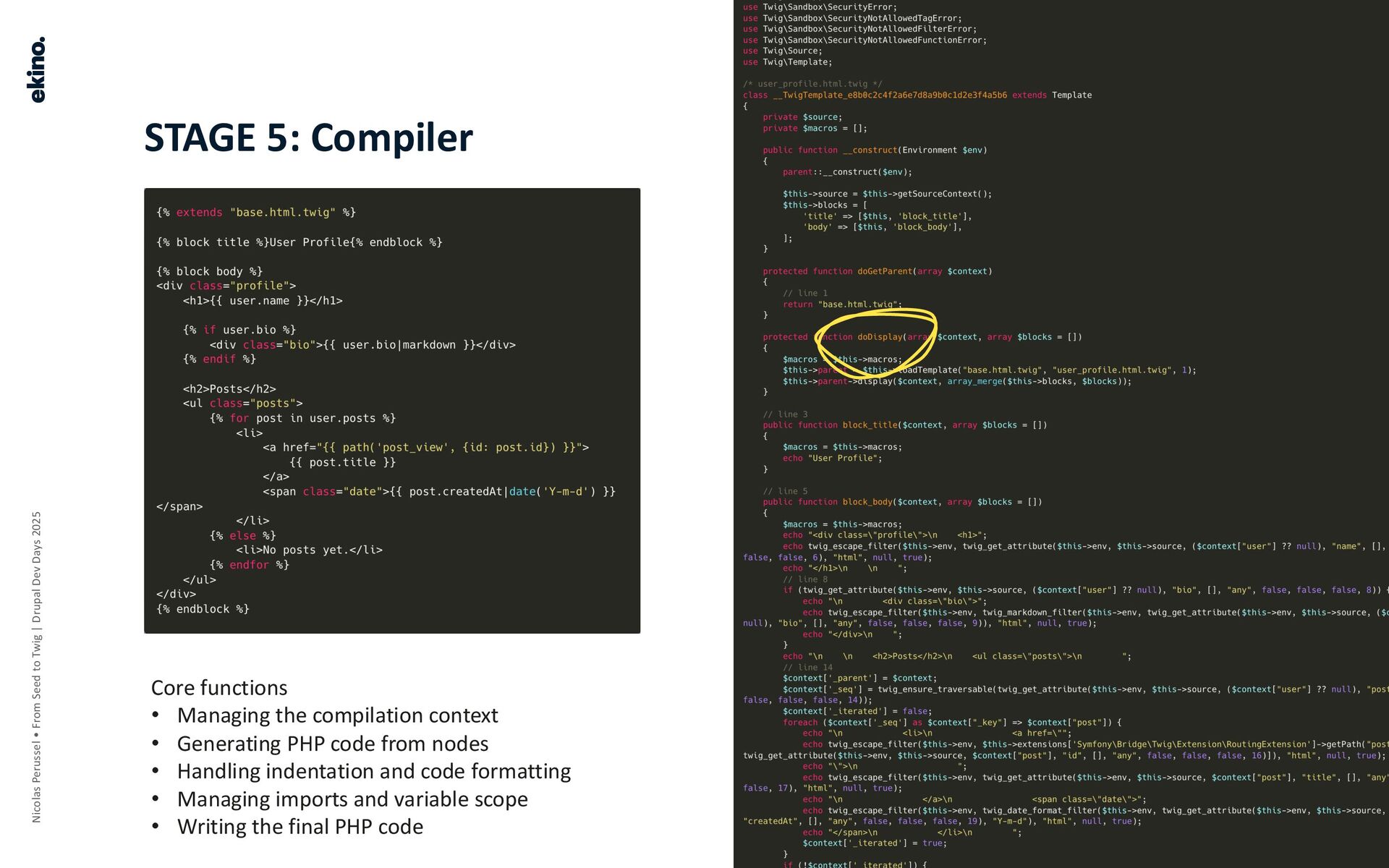 • Core Functions: Generating PHP code from nodes, managing the compilation context, and handling indentation and variable scope.