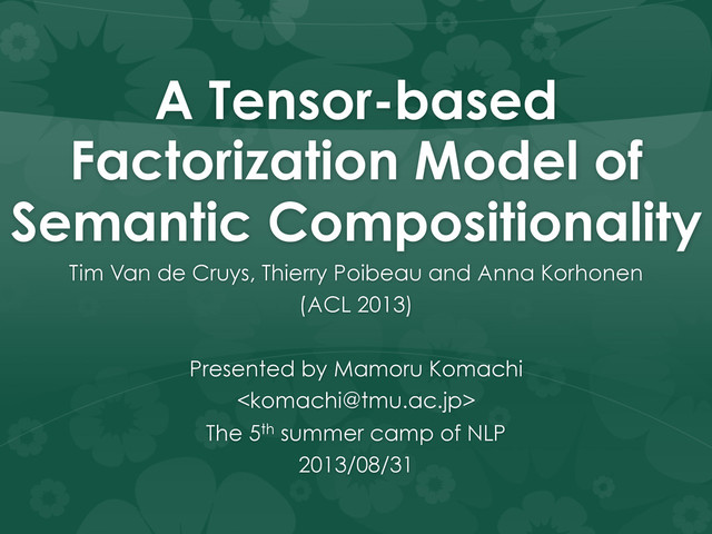 Slides presented at the Summer Camp of Natural Language Processing 2013. Tim Van de Cruys, Thierry Poibeau and Anna Korhonen. A Tensor-based Factorization Model of Semantic Compositionality. ACL 2013.