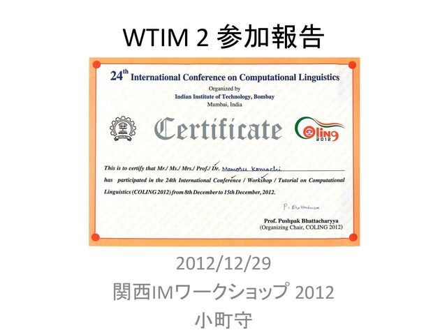 COLING 2012 と連続開催のテキスト入力に関する国際ワークショップ、Second Workshop on Advances in Text Input Methods (WTIM 2) の参加報告です。第4回関西入力メソッドワークショップにて発表しました。