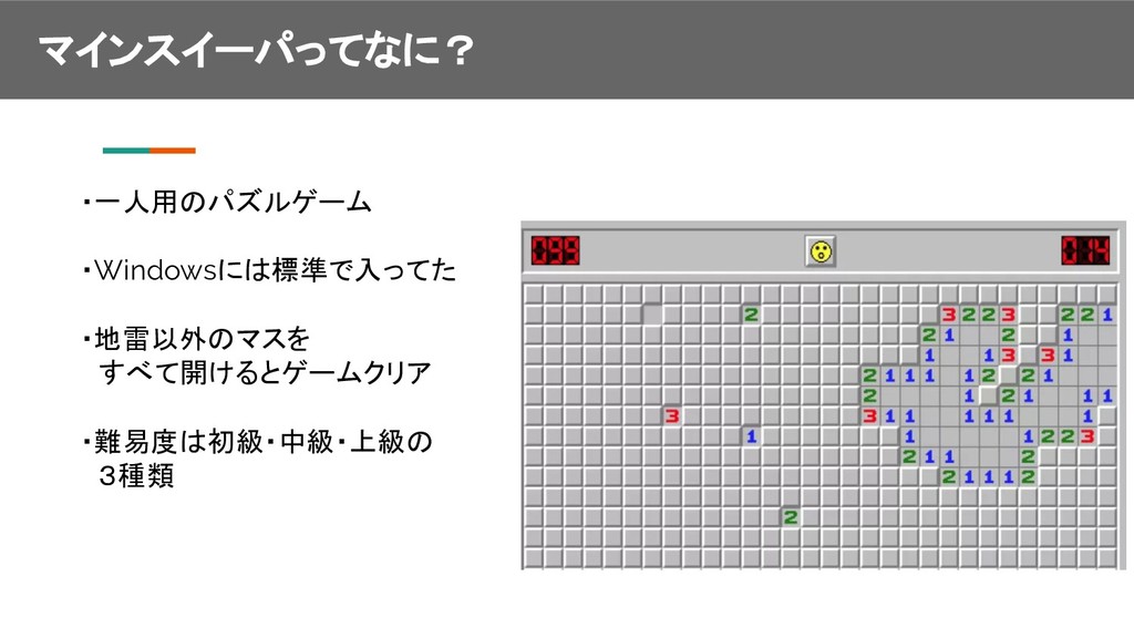 マインスイーパってなに? ・一人用のパズルゲーム ・Windowsには標準で入ってた ・地雷以外のマスを すべて開けるとゲームクリア ・難易度は初級・中級・上級の 3種類