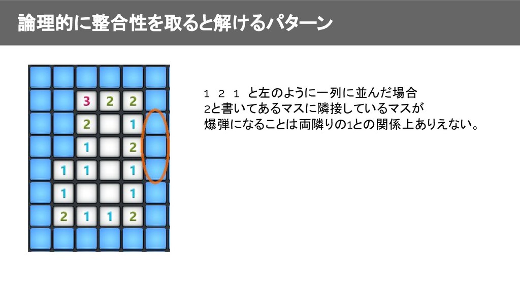 論理的に整合性を取ると解けるパターン 1 2 1 と左のように一列に並んだ場合 2と書いてあるマスに隣接しているマスが 爆弾になることは両隣りの1との関係上ありえない。