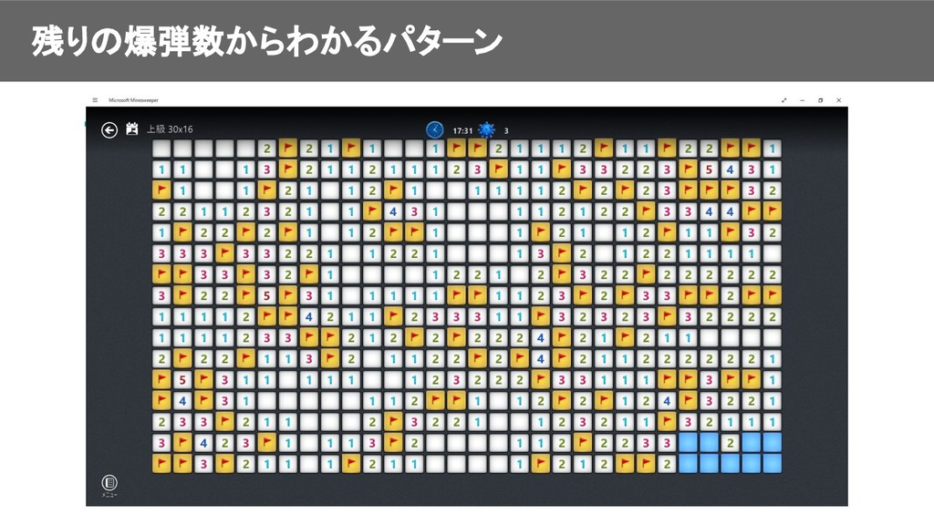 クリアのコツ ・一見詰んでいるように見えても安全なマスがある場合が多い ・手をつけているところが詰まってきたら他の場所を崩してみる ・旗を使うと残りの爆弾数がわかるので 詰将棋のように爆弾のパターンがわかる場合がある