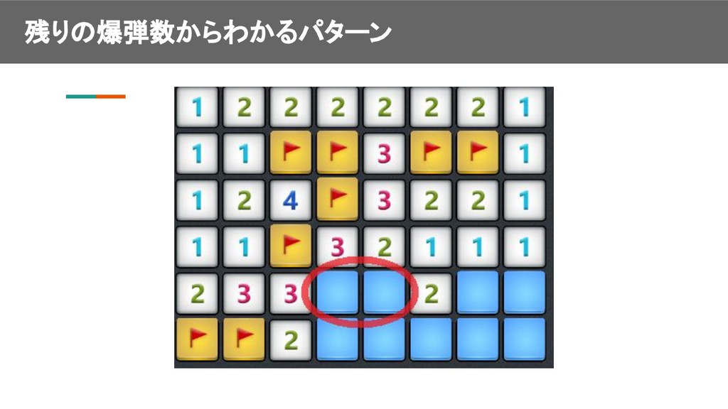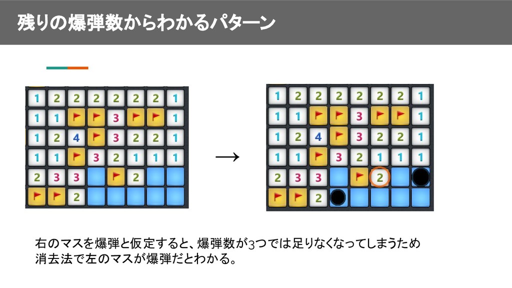 残りの爆弾数からわかるパターン → 右のマスを爆弾と仮定すると、爆弾数が3つでは足りなくなってしまうため 消去法で左のマスが爆弾だとわかる。