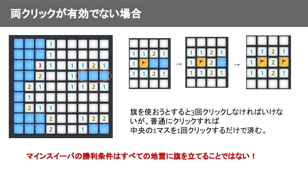 両クリックが有効でない場合 → → 旗を使おうとすると3回クリックしなければいけな いが、普通にクリックすれば 中央の1マスを1回クリックするだけで済む。 マインスイーパの勝利条件はすべての地雷に旗を立てることではない!