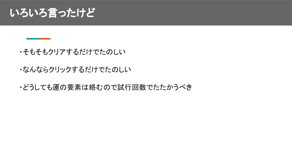 いろいろ言ったけど ・そもそもクリアするだけでたのしい ・なんならクリックするだけでたのしい ・どうしても運の要素は絡むので試行回数でたたかうべき