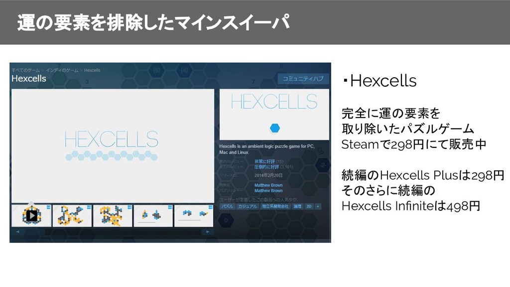 運の要素を排除したマインスイーパ ・Hexcells 完全に運の要素を 取り除いたパズルゲーム Steamで298円にて販売中 続編のHexcells Plusは298円 そのさらに続編の Hexcells Infiniteは498円