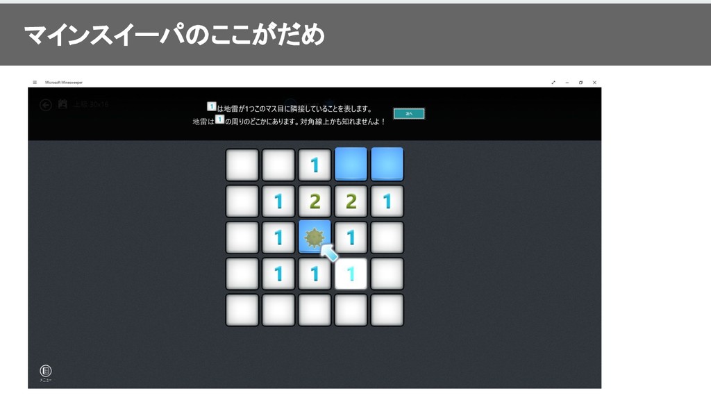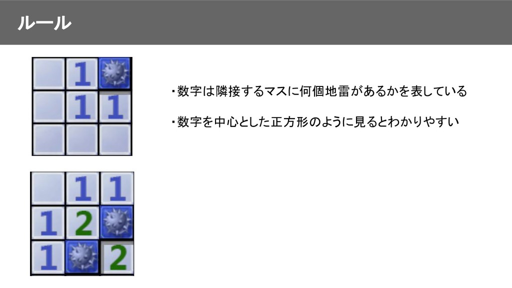 ルール ・数字は隣接するマスに何個地雷があるかを表している ・数字を中心とした正方形のように見るとわかりやすい
