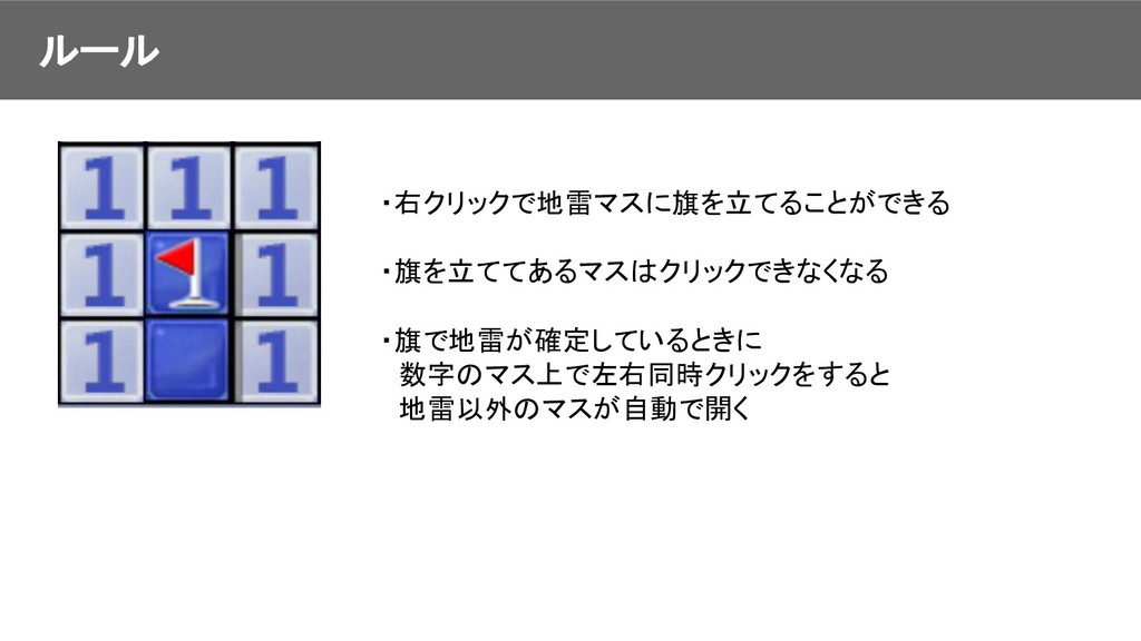 ルール ・右クリックで地雷マスに旗を立てることができる ・旗を立ててあるマスはクリックできなくなる ・旗で地雷が確定しているときに 数字のマス上で左右同時クリックをすると 地雷以外のマスが自動で開く