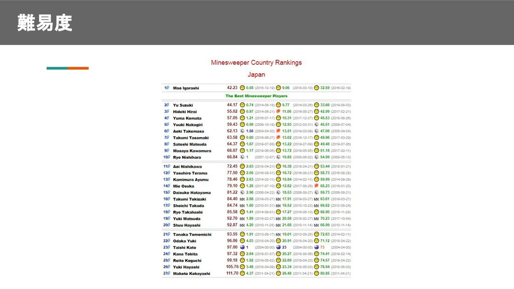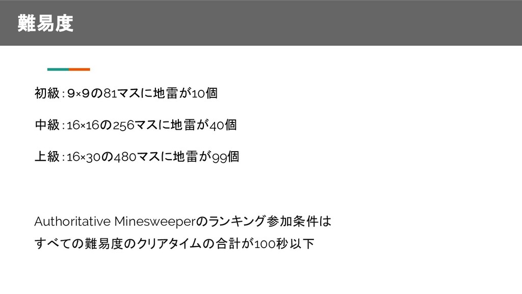 難易度 初級:9×9の81マスに地雷が10個 中級:16×16の256マスに地雷が40個 上級:16×30の480マスに地雷が99個 Authoritative Minesweeperのランキング参加条件は すべての難易度のクリアタイムの合計が100秒以下