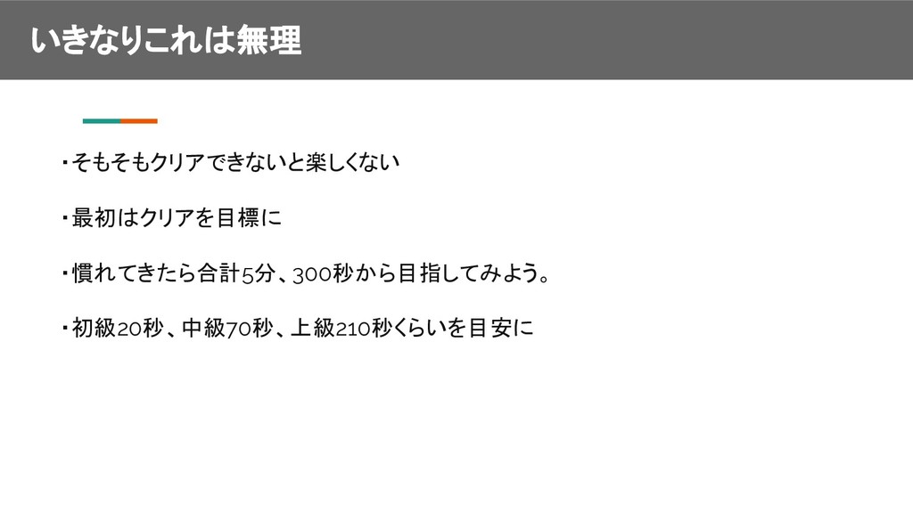 いきなりこれは無理 ・そもそもクリアできないと楽しくない ・最初はクリアを目標に ・慣れてきたら合計5分、300秒から目指してみよう。 ・初級20秒、中級70秒、上級210秒くらいを目安に