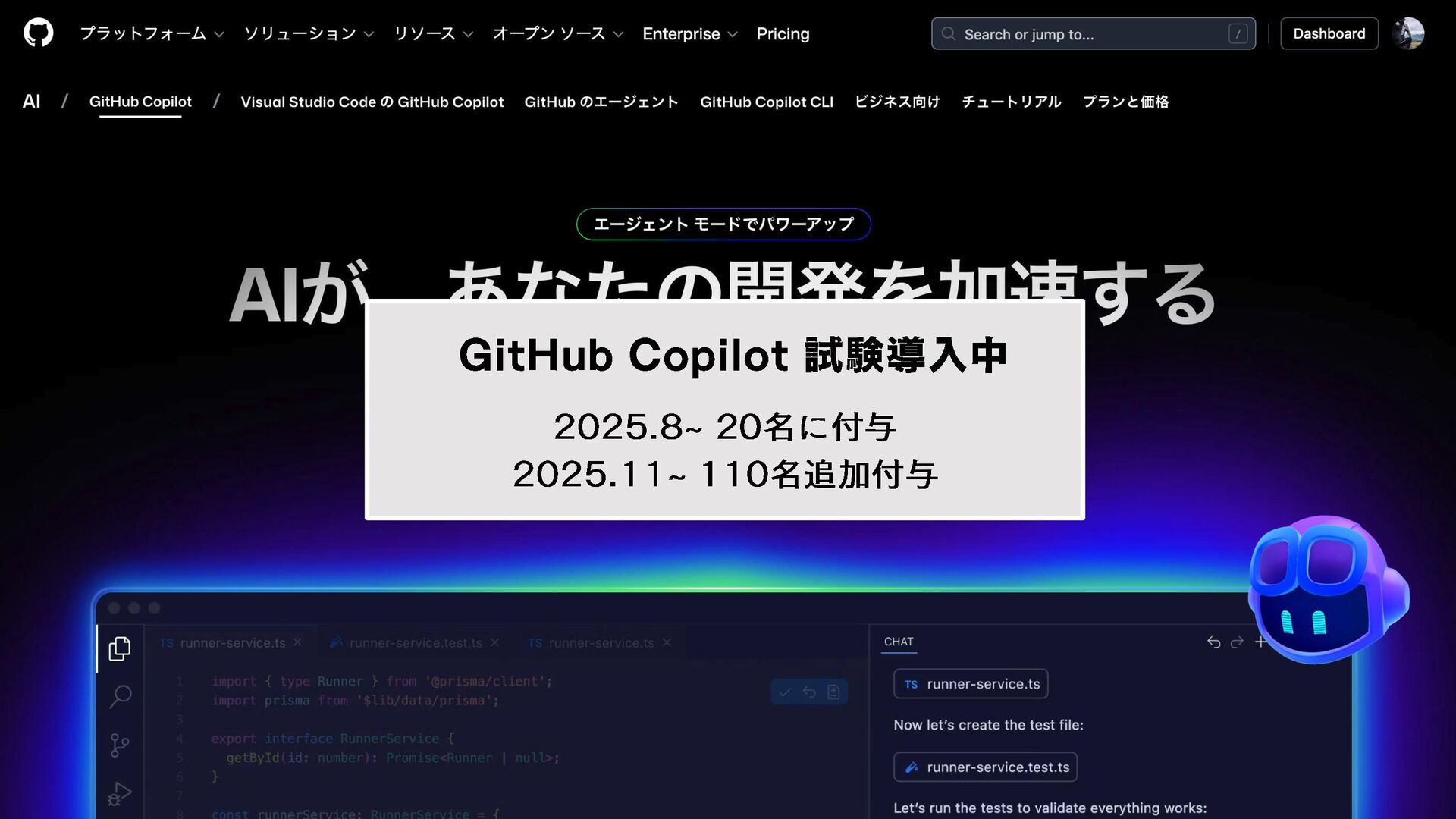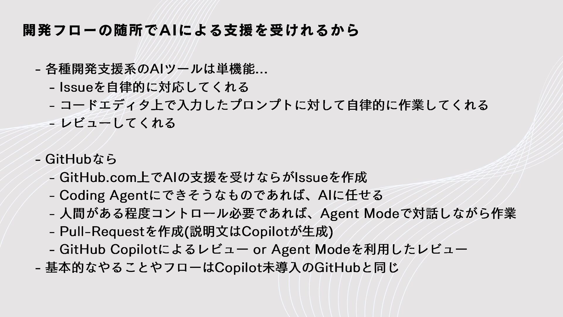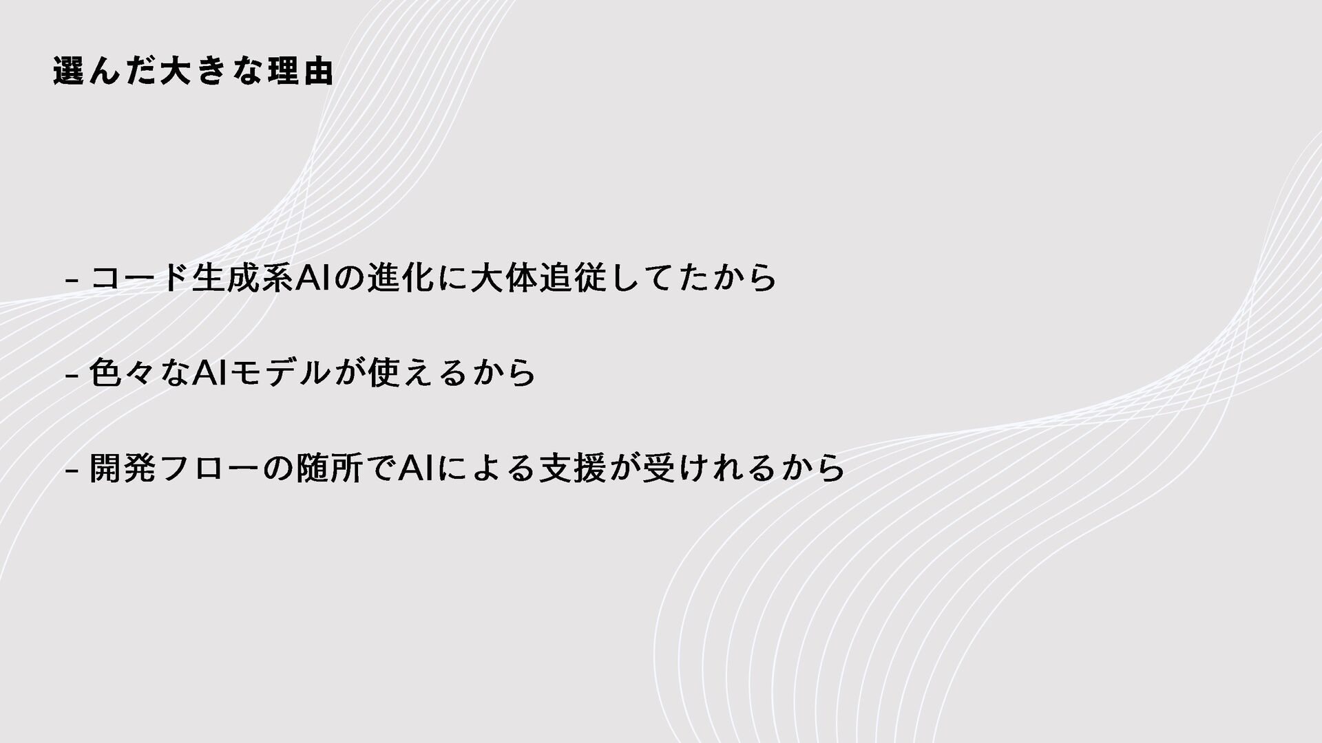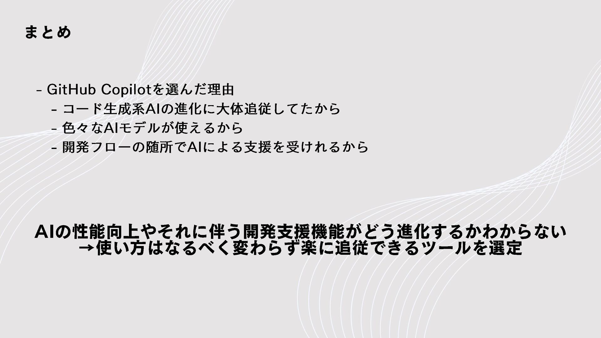 受託開発企業における開発支援AIの選定にGitHub Copilotを選定した理由を説明しています。