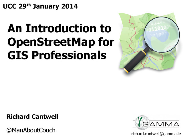 / Management Data Licensing How OSM represents data in GIS Terms: Nodes / Ways / Relations Key / Value pairs TagInfo Contributing: GIS Based Editors Consuming: Tiles, Files and API’s: Tileservers – your own and/or others Files – Downloads, Databases & QGIS API’s – OverPass Turbo TileMill Spatialite Wider Issues: Comparing OSM and Commercial Data What now for Commercial Mapping? The future of Tiles Close: Contacting OSM 10 'Takeaways' Q & A