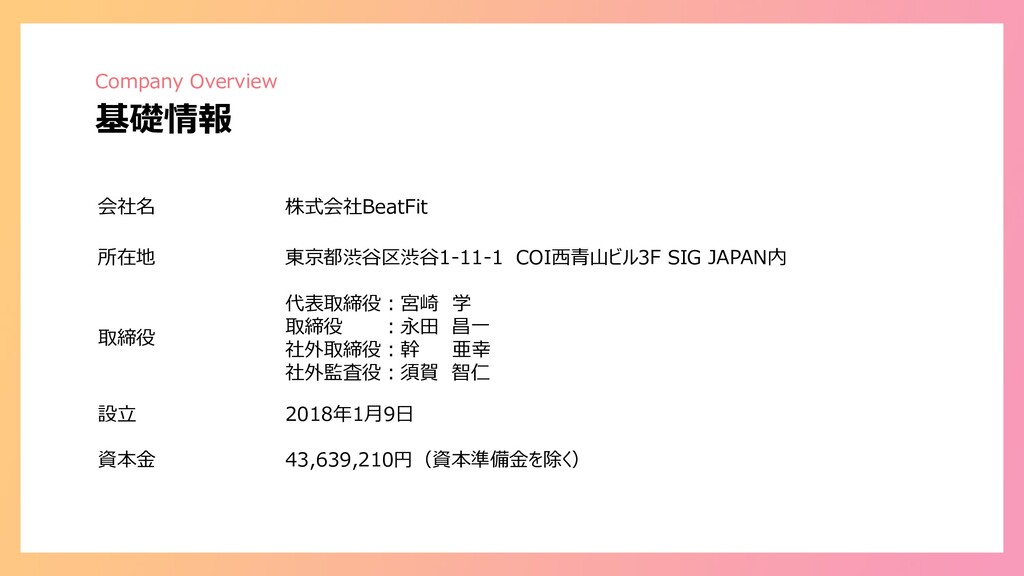 Confidential Company Overview 基礎情報 会社名 株式会社BeatFit 所在地 東京都渋谷区渋谷1-11-1 COI西青山ビル3F SIG