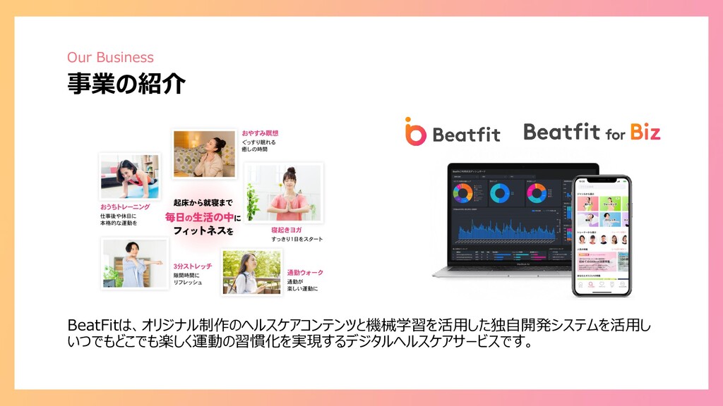 Confidential Our Business 事業の紹介 BeatFitは、オリジナル制作のヘルスケアコンテンツと機械学習を活用した独自開発システムを活用し いつでもどこでも楽しく運動の習慣化を実現するデジタルヘルスケアサービスです。