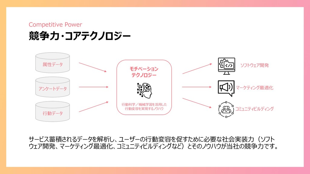 テクノロジー 行動科学/機械学習を活用した 行動変容を実現するノウハウ ソフトウェア開発 マーケティング最適化 コミュニティビルディング