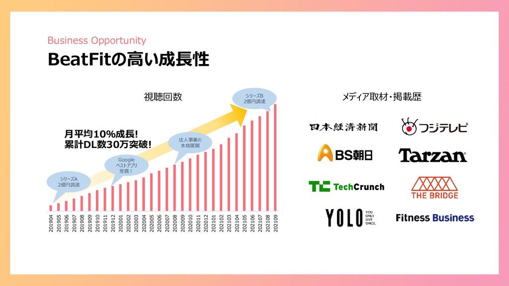 201910 201911 201912 202001 202002 202003 202004 202005 202006 202007 202008 202009 202010 202011 202012 202101 202102 202103 202104 202105 202106 202107 202108 202109 視聴回数 月平均10%成長! 累計DL数30万突破! メディア取材・掲載歴 シリーズA 2億円調達 Google ベストアプリ 受賞! 法人事業の 本格展開 シリーズB 2億円調達