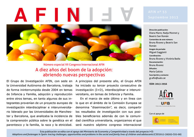 donde realiza una tesis doctoral sobre el sis- tema chino de acogimiento familiar de niños y niñas con “necesidades especiales” que posteriormente serán adop- tados transnacionalmente, presentará los resultados de su trabajo de campo realizado en un orfanato de la ciudad de Nanchang, capital de la provincia de Jiangxi, al sudeste de la República Popular China, donde el idioma local no es el mandarín, sino una variante del chino gan lo, lo que lo hace particularmente interesante, por su mayor inaccesibilidad desde la perspectiva de los estudios occidentales. Ángel Martínez Puente Educador social y Director de Faiben, Fundación de Apoyo a la Infancia y al Bienestar (Galicia), realiza tareas de acompa- ñamiento a las familias adoptivas de niños con “necesidades especiales”. Presentará su experiencia en adopciones “espe- ciales” en Galicia. Con más de tres décadas de experiencia profesional trabajando como educador en casas de familia (hogares sustitutos para niños, niñas y adolescentes tutela- dos), Martínez Puente ha intervenido en numerosas adopcio- nes de este tipo, entre las que se incluyen las de personas adoptadas en los últimos años de su adolescencia. Hace ya varios años que los resultados de investigación del Grupo AFIN sugieren la conveniencia de redefinir las actualmente de- nominadas “necesidades especiales”, entre otras cosas porque, cuando en España una familia decide adoptar un niño o niña con “necesidades especiales”, lo hace pensando en dificultades de salud física abordables desde los recursos sanitarios disponibles en España. Sin embargo, algunas familias adoptivas reportan dificultades con sus hijos e hijas por situaciones que, si bien en algunos casos solo requieren de orientaciones o intervenciones puntuales, en otros suponen verdaderos riesgos de ruptura o ruptura evidente o encubierta. Al mismo tiempo, se han incrementado las dificultades para adoptar niños o niñas pequeños, sanos y huérfanos, por lo que cada vez más solo se accede a niños-as “mayores”, muchos de los cuales no son huérfanos sino “huérfanos sociales” que, en algunos casos, han sido recientemente separados de una familia o madre biológica y, en otros, una parte de su vida ha transcurrido en diversas instituciones y/o familias y, por tanto, presentan “nece- sidades” que no se consideran “especiales” cuando se concede la idoneidad a una familia. Asimismo, no son pocas las ocasiones en que son las familias adoptivas las que llegan muy “dañadas” y con una “mochila” muy llena a la adopción. Si bien, no son considera- das “familias con necesidades especiales”, sería conveniente tener en cuenta que, aunque muchas de ellas son idóneas, necesitan apoyo o acompañamiento para asumir la paternidad o maternidad de ciertos hijos o hijas e, incluso, de cualquier hijo o hija. Segunda Sesión: REDEFINIENDO LAS ‘NECESIDADES ESPECIALES’ Continuando con la propuesta habitual del Grupo AFIN de presentar experiencias personales de quienes en algún momento de sus vidas han atravesado por alguna de las circunstancias que habitualmente trabaja- mos, estudiamos o analizamos, en esta sesión participará también una persona adoptada en la adolescencia en lo que podría considerarse una adopción “especial”. AFIN nº 53 pág. 4
