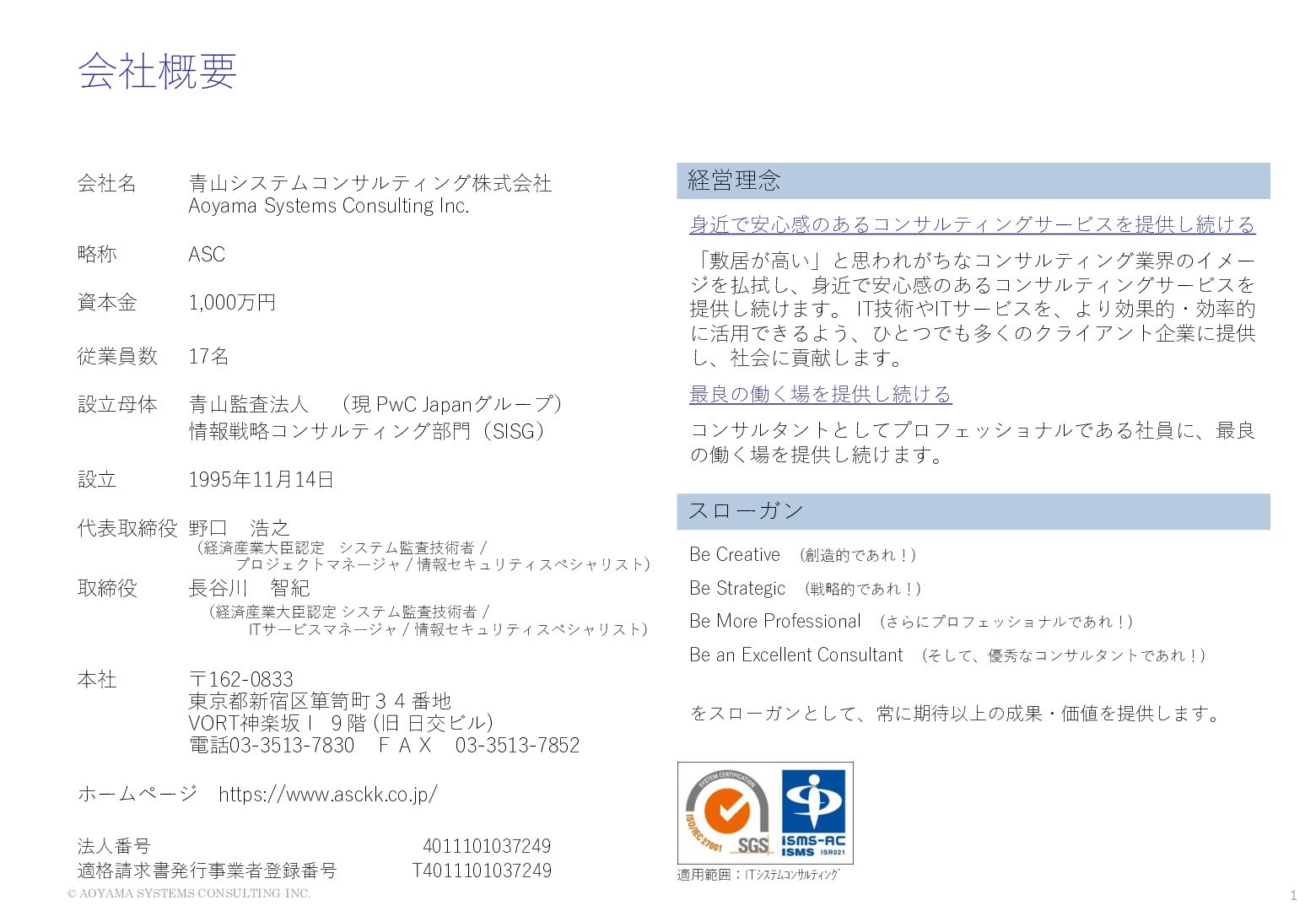 Systems Consulting Inc. 略称 ASC 資本金 1,000万円 従業員数 17名 設立母体 青山監査法人 (現 PwC Japanグループ) 情報戦略コンサルティング部門(SISG) 設立 1995年11月14日 代表取締役 野口 浩之 (経済産業大臣認定 システム監査技術者 / プロジェクトマネージャ / 情報セキュリティスペシャリスト) 取締役 長谷川 智紀 (経済産業大臣認定 システム監査技術者 / ITサービスマネージャ / 情報セキュリティスペシャリスト) 本社 〒162-0833 東京都新宿区箪笥町34番地 VORT神楽坂Ⅰ 9階 (旧 日交ビル) 電話03-3513-7830 FAX 03-3513-7852 ホームページ https://www.asckk.co.jp/ 法人番号 4011101037249 適格請求書発行事業者登録番号 T4011101037249 経営理念 身近で安心感のあるコンサルティングサービスを提供し続ける 「敷居が高い」と思われがちなコンサルティング業界のイメー ジを払拭し、身近で安心感のあるコンサルティングサービスを 提供し続けます。 IT技術やITサービスを、より効果的・効率的 に活用できるよう、ひとつでも多くのクライアント企業に提供 し、社会に貢献します。 最良の働く場を提供し続ける コンサルタントとしてプロフェッショナルである社員に、最良 の働く場を提供し続けます。 スローガン Be Creative (創造的であれ!) Be Strategic (戦略的であれ!) Be More Professional (さらにプロフェッショナルであれ!) Be an Excellent Consultant (そして、優秀なコンサルタントであれ!) をスローガンとして、常に期待以上の成果・価値を提供します。 適用範囲:ITシステムコンサルティング