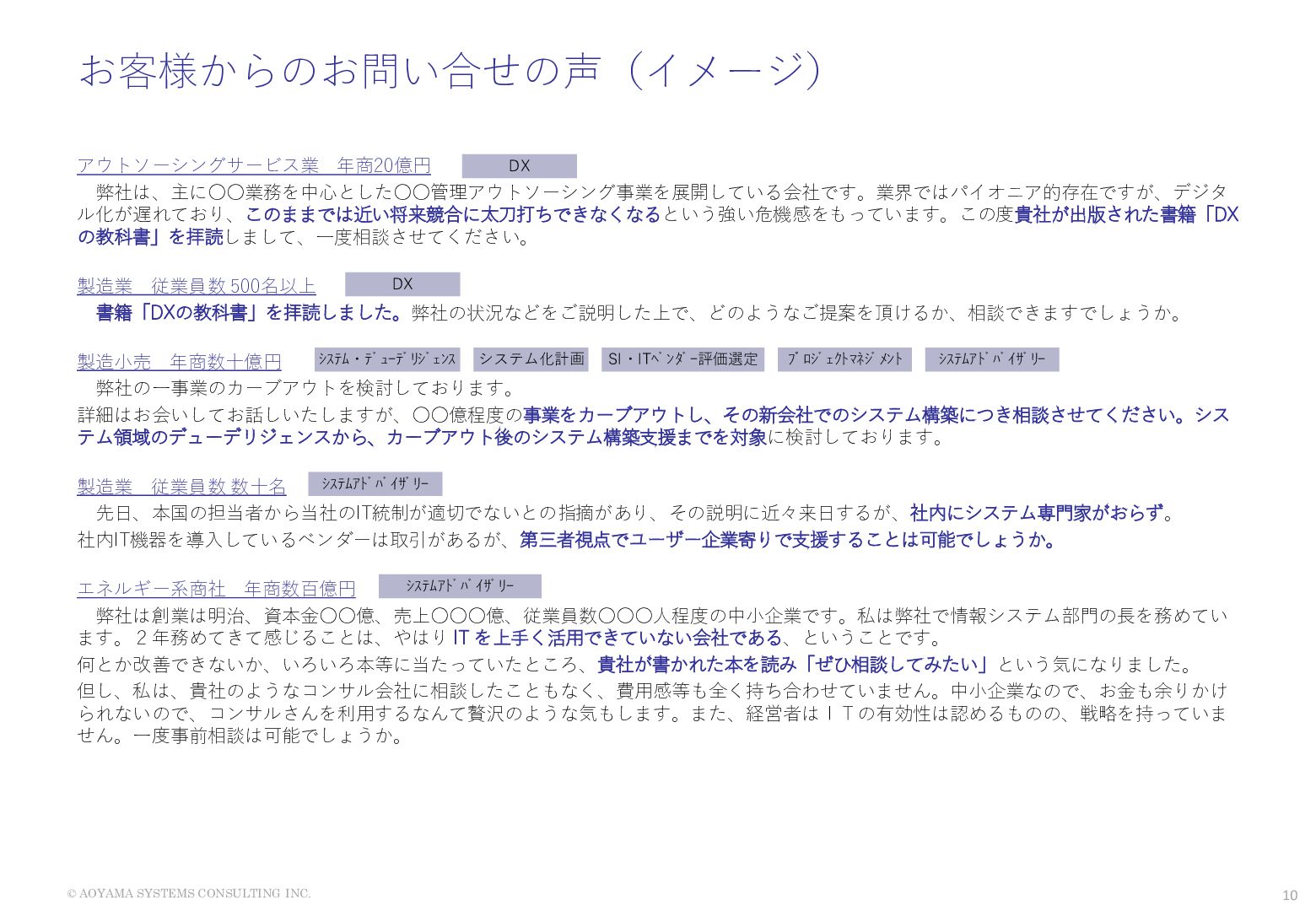 © AOYAMA SYSTEMS CONSULTING INC. お客様からのお問い合せの声(イメージ) 10 アウトソーシングサービス業 年商20億円 弊社は、主に◦◦業務を中心とした◦◦管理アウトソーシング事業を展開している会社です。業界ではパイオニア的存在ですが、デジタ