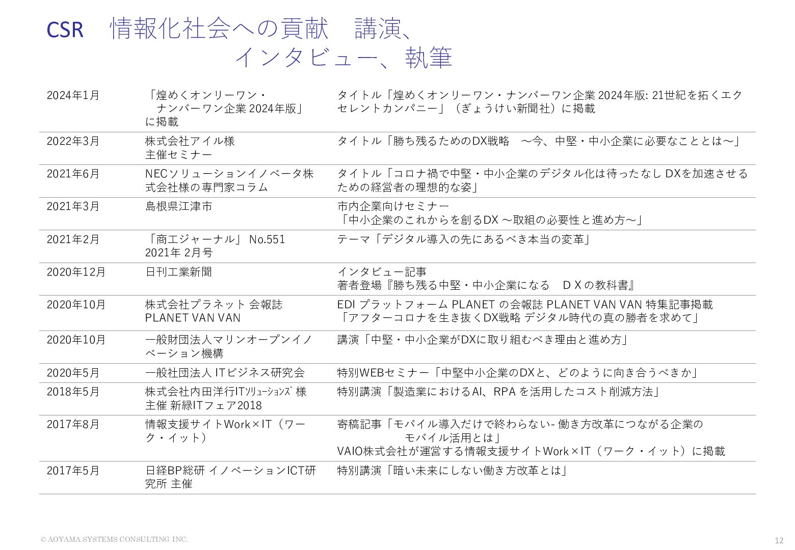 © AOYAMA SYSTEMS CONSULTING INC. CSR 情報化社会への貢献 講演、 インタビュー、執筆 12