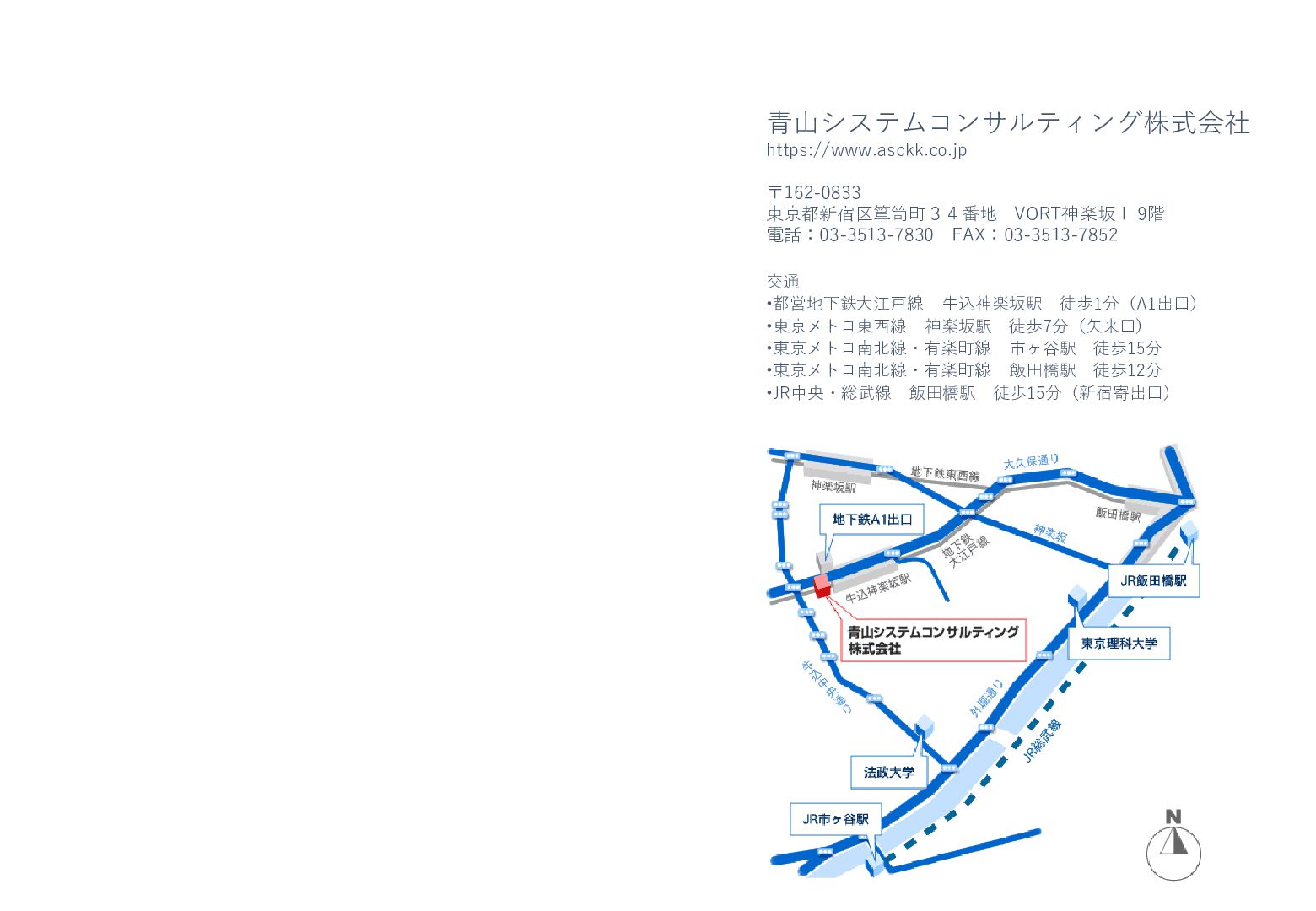 青山システムコンサルティング株式会社 https://www.asckk.co.jp 〒162-0833 東京都新宿区箪笥町34番地 VORT神楽坂Ⅰ 9階 電話:03-3513-7830 FAX:03-3513-7852 交通 •都営地下鉄大江戸線