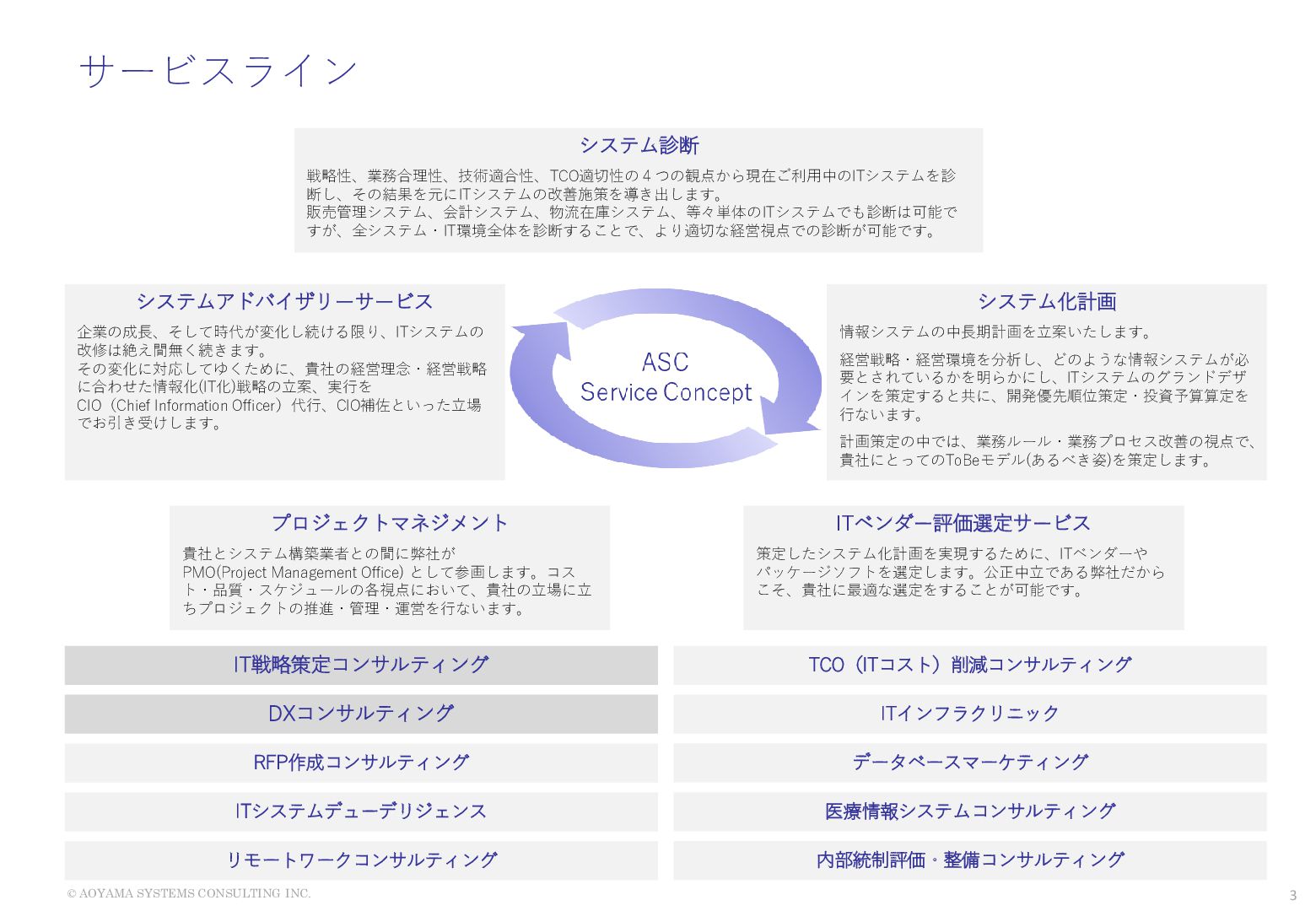 © AOYAMA SYSTEMS CONSULTING INC. サービスライン 3 システム診断 戦略性、業務合理性、技術適合性、TCO適切性の4つの観点から現在ご利用中のITシステムを診 断し、その結果を元にITシステムの改善施策を導き出します。
