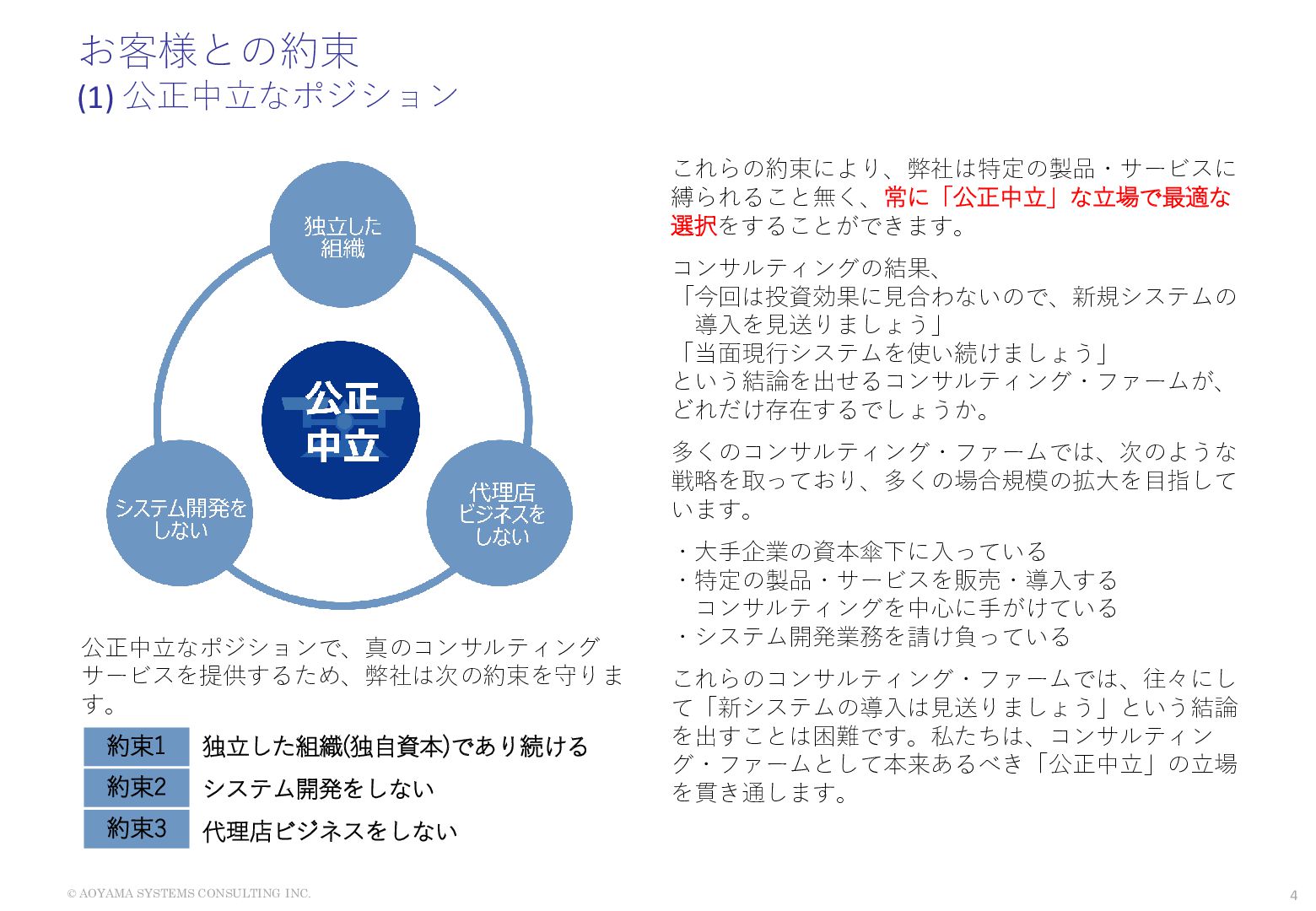 © AOYAMA SYSTEMS CONSULTING INC. お客様との約束 (1) 公正中立なポジション 4 これらの約束により、弊社は特定の製品・サービスに