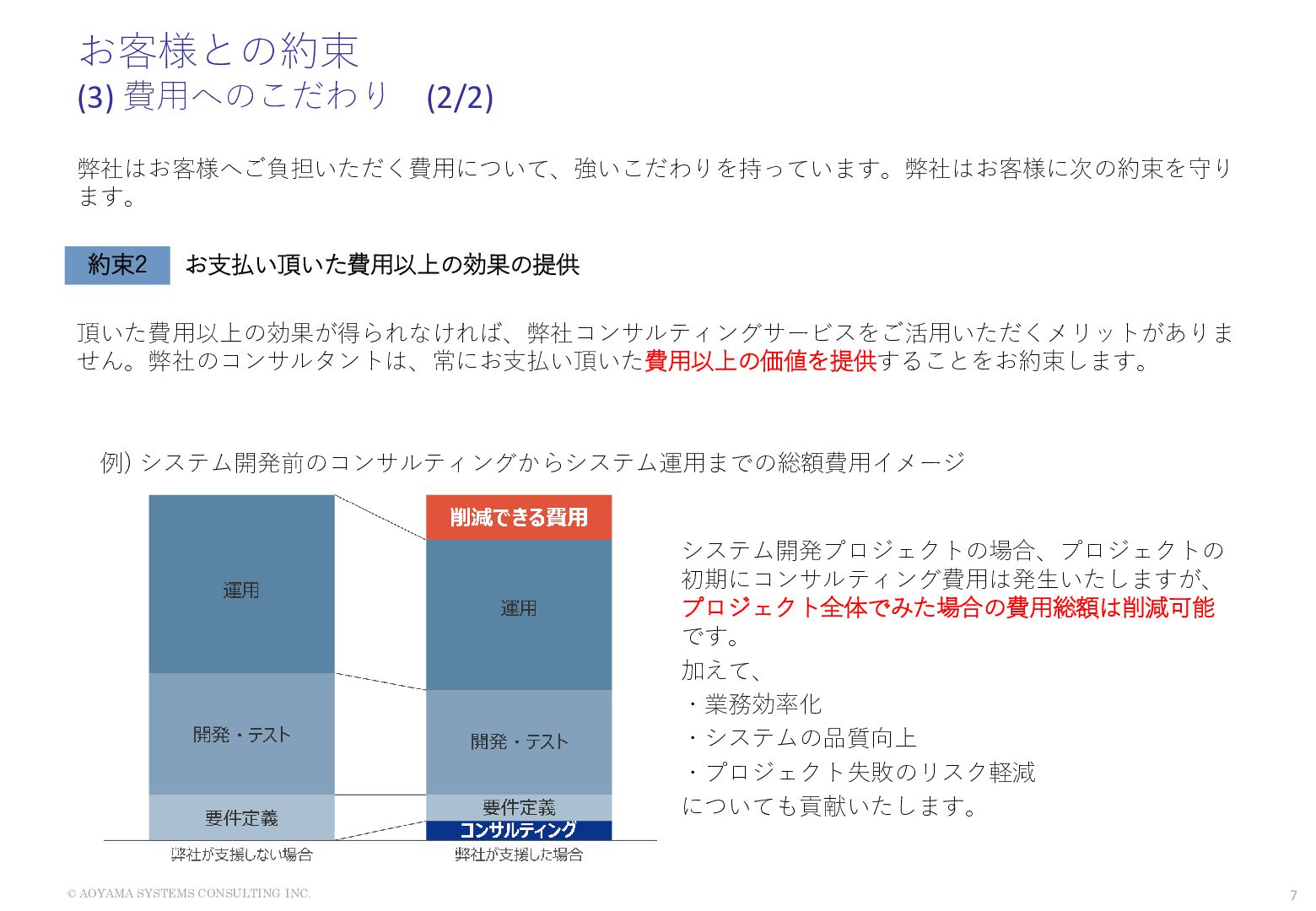 © AOYAMA SYSTEMS CONSULTING INC. お客様との約束 (3) 費用へのこだわり (2/2) 弊社はお客様へご負担いただく費用について、強いこだわりを持っています。弊社はお客様に次の約束を守り
